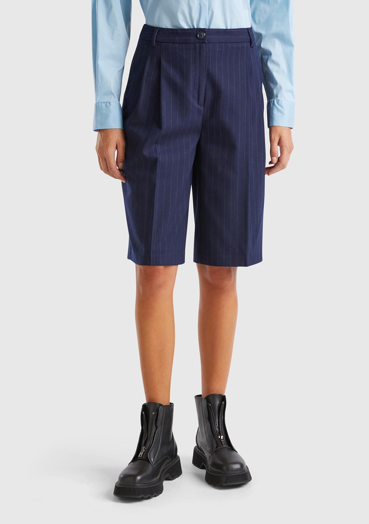 Kadın Lacivert Viskoz Karışımlı Pile Detaylı İnce Çizgili Bermuda Şort