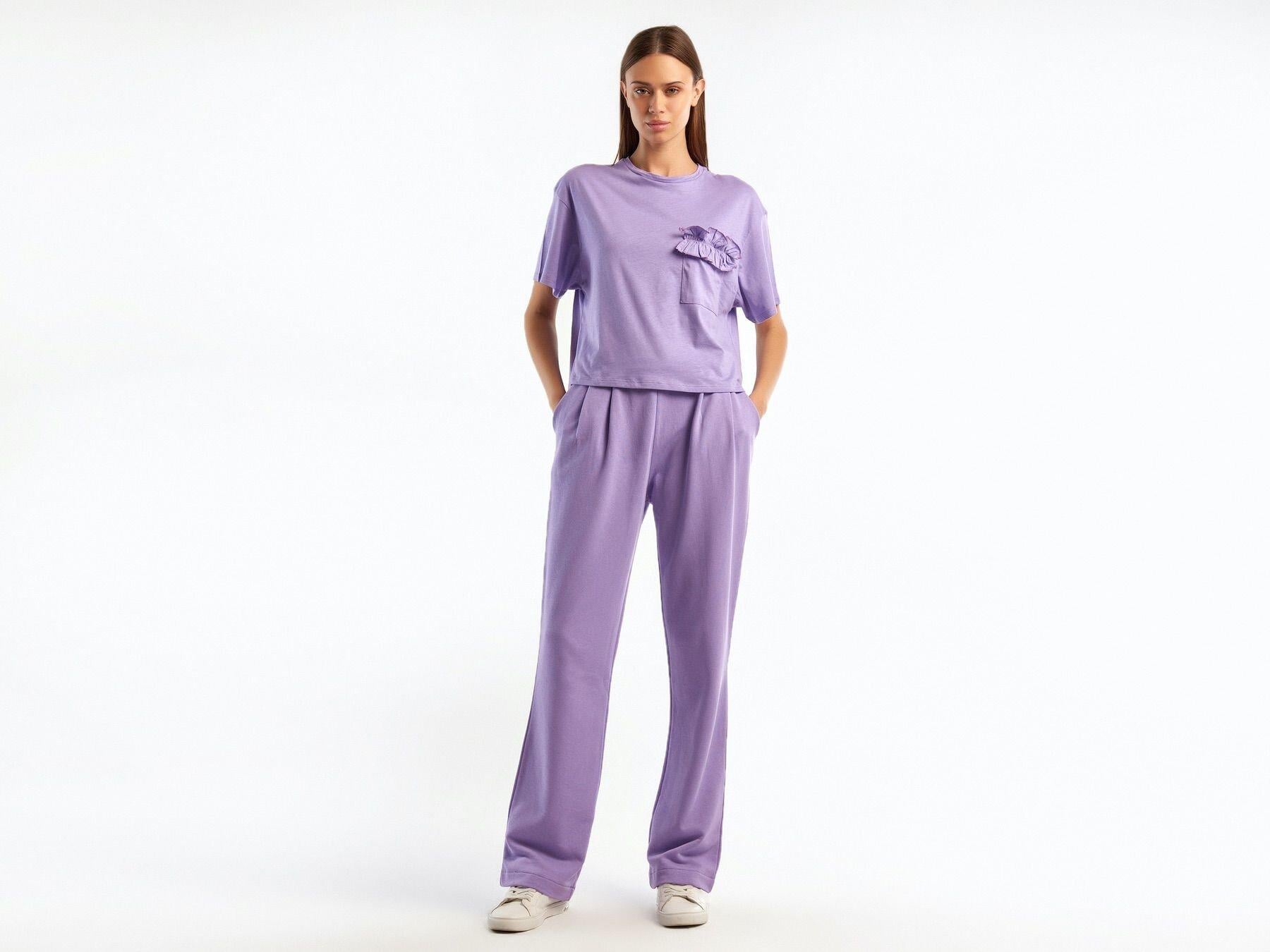 Kadın Lila %100 Koton Beli Lastikli Rahat Kalıp Pantolon