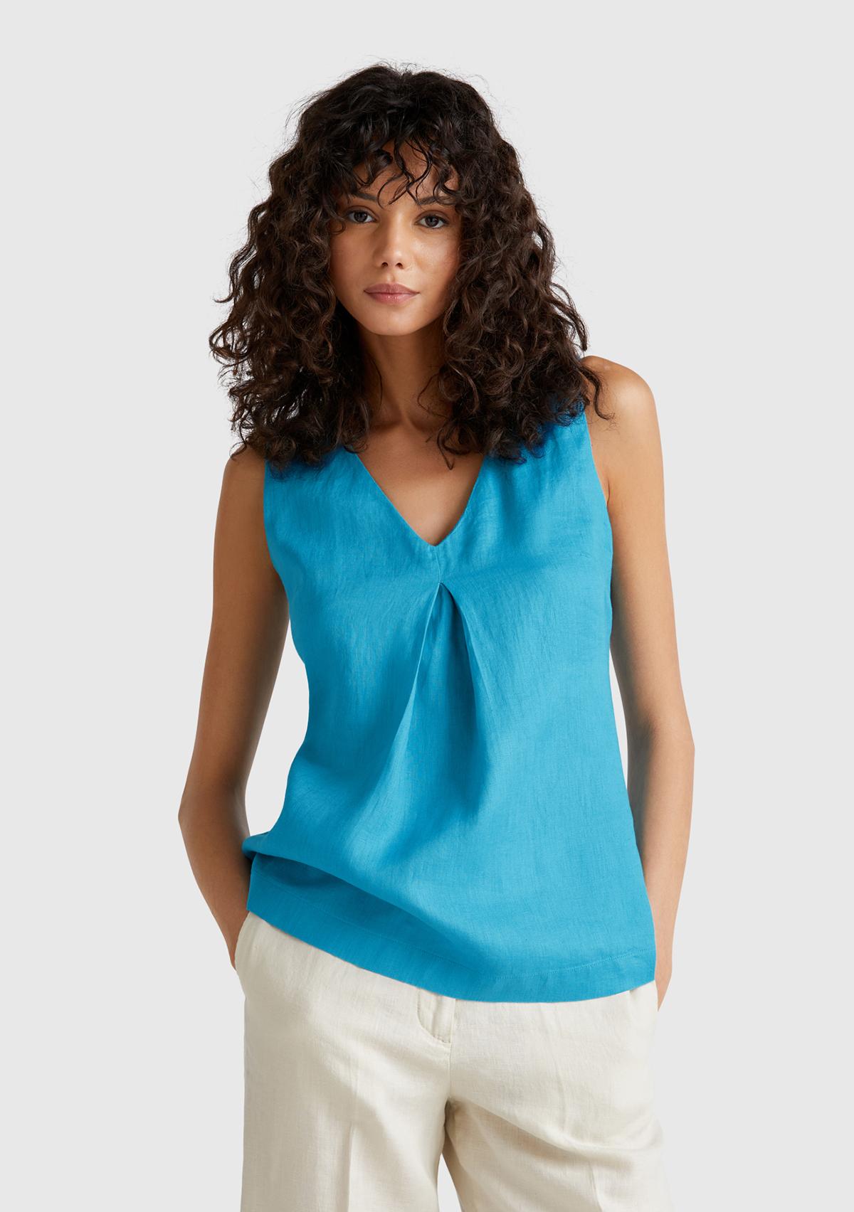 Kadın Mavi %100 Keten V Yaka Kolsuz Geniş Kesim Bluz
