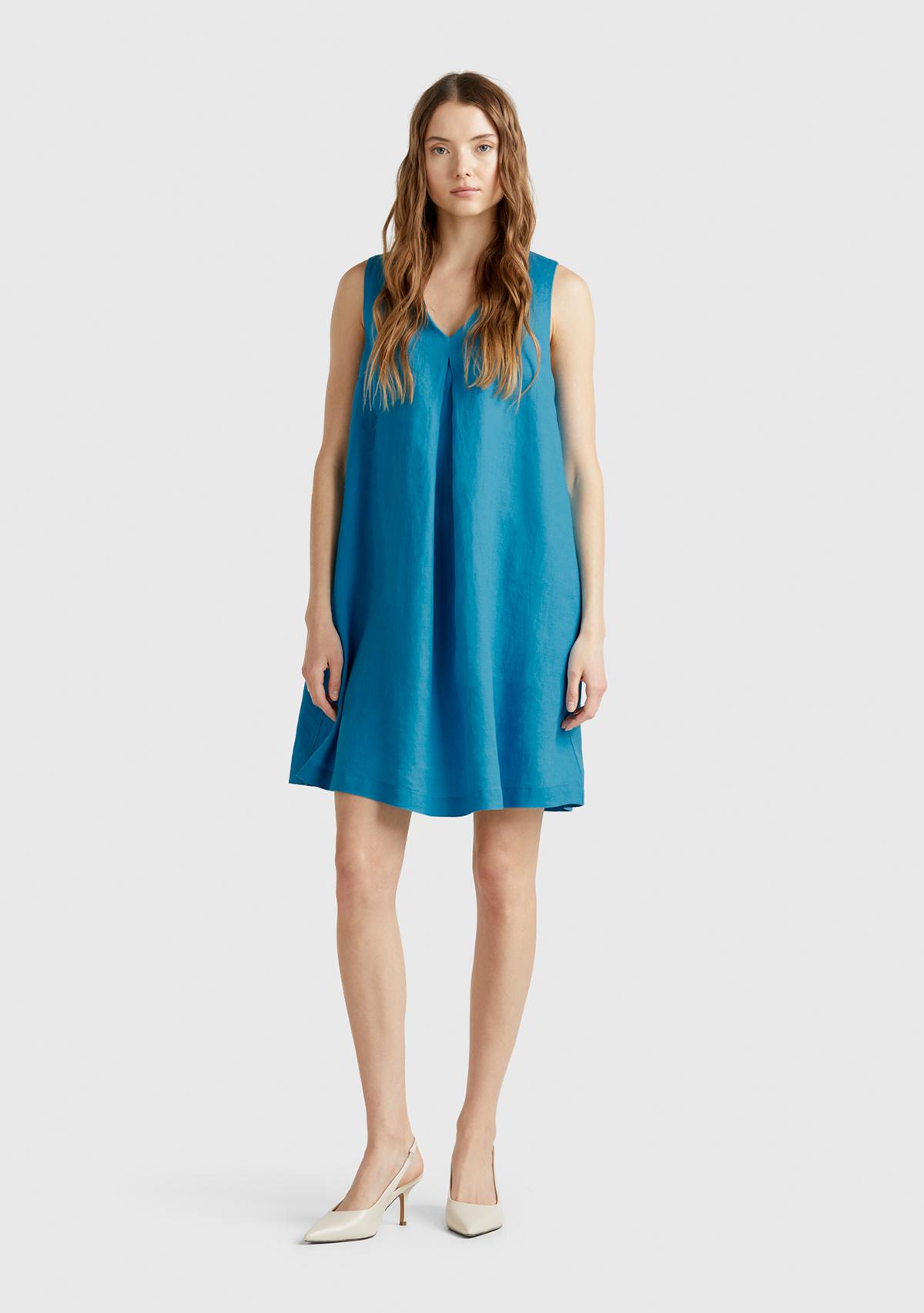 Kadın Mavi %100 Keten Yanı Fermuarlı A Kesim V Yaka Kısa Elbise