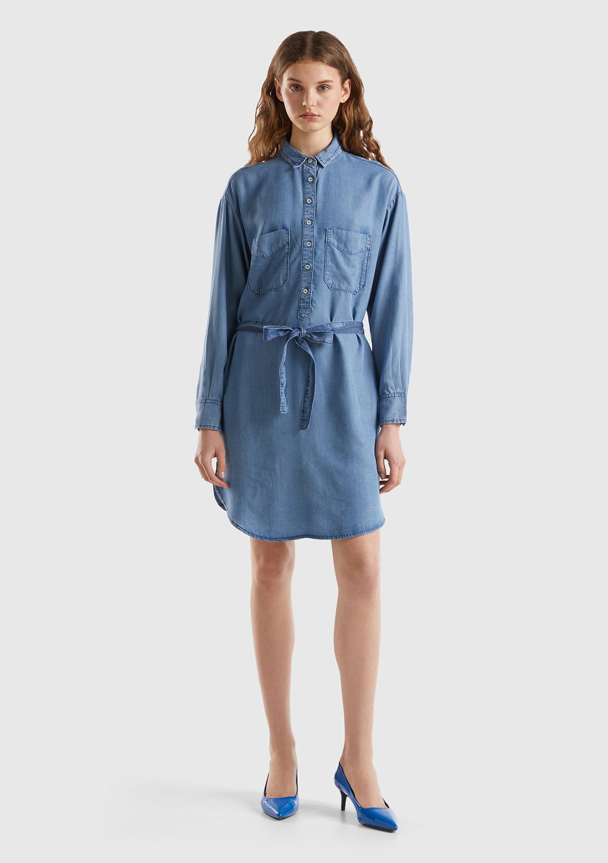 Kadın Mavi %100 Liyosel Göğsü Yama Cepli Belden Bağlamalı Denim Elbise
