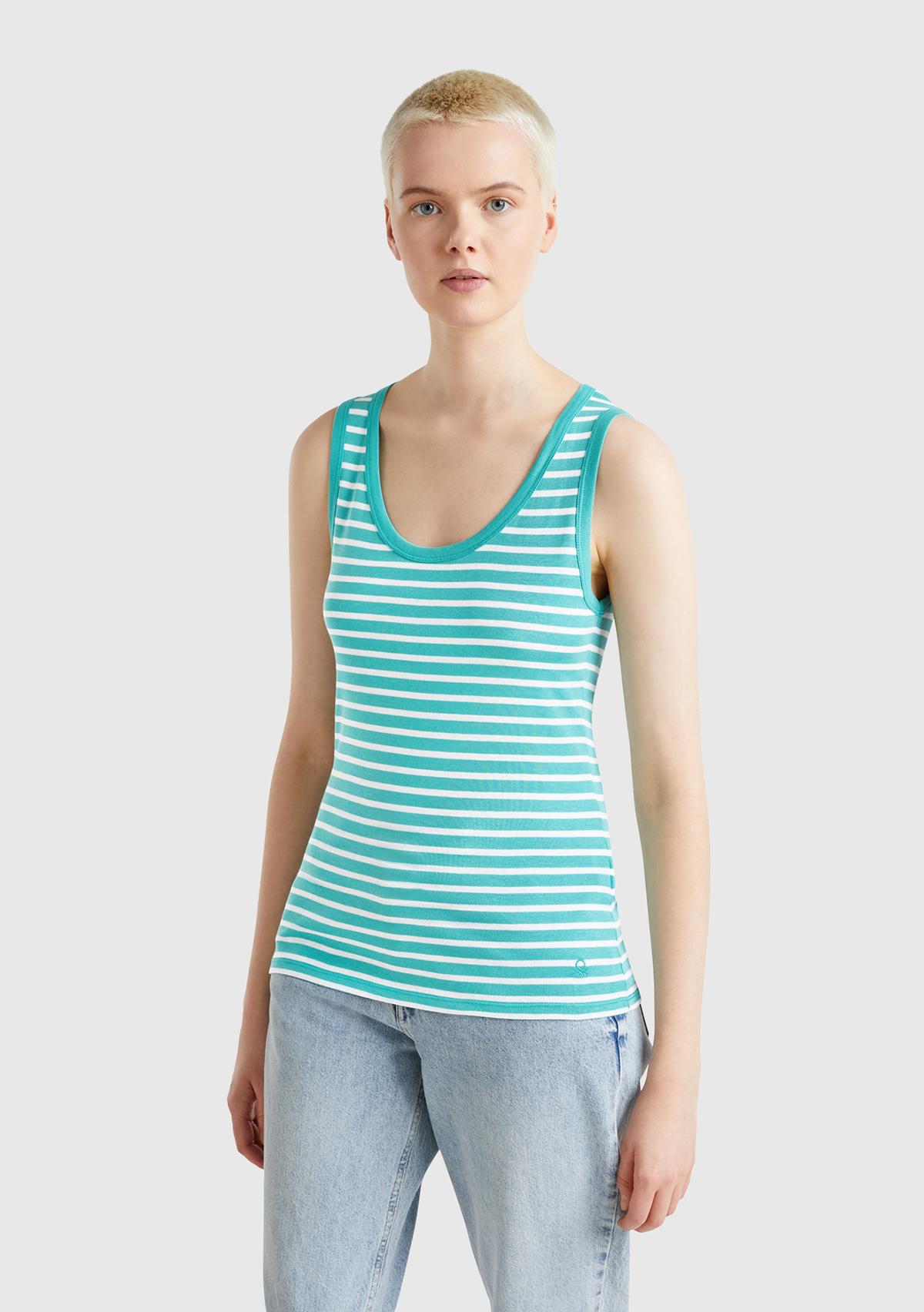 Kadın Mavi %100 Pamuk Çizgili Logo İşleme Detaylı Regular Fit Atlet