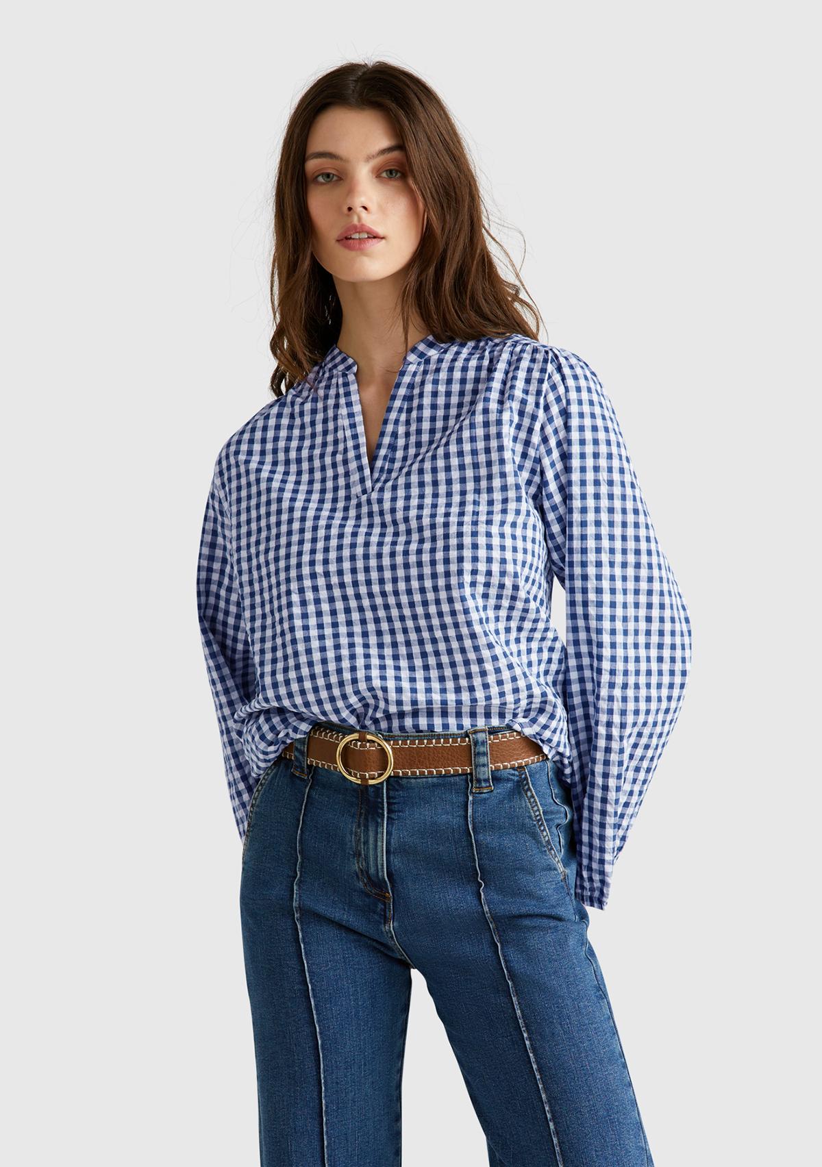 Kadın Mavi %100 Pamuk Pötikareli Relax Fit V Yaka Bluz