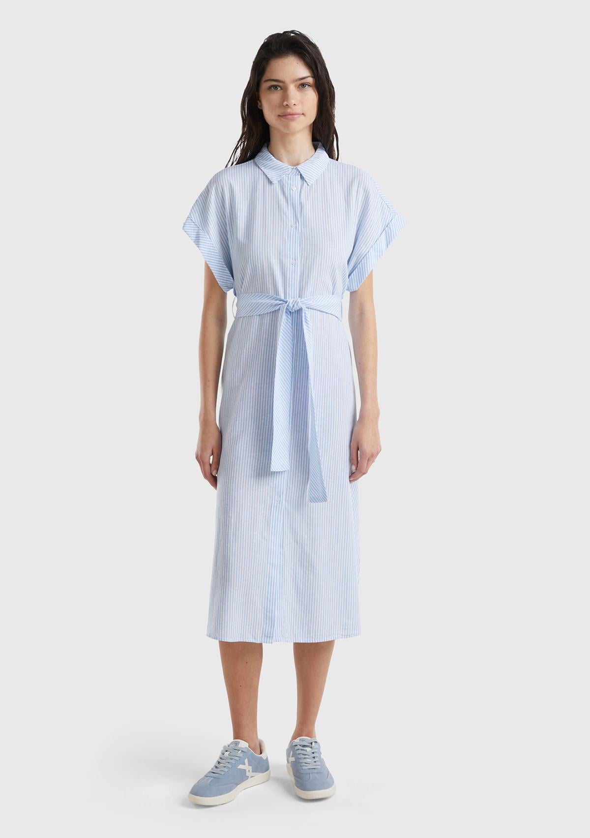 Kadın Mavi- Keten Karışımlı Beli Bağlamlı Önü Düğmeli Yırtmaçlı Elbise