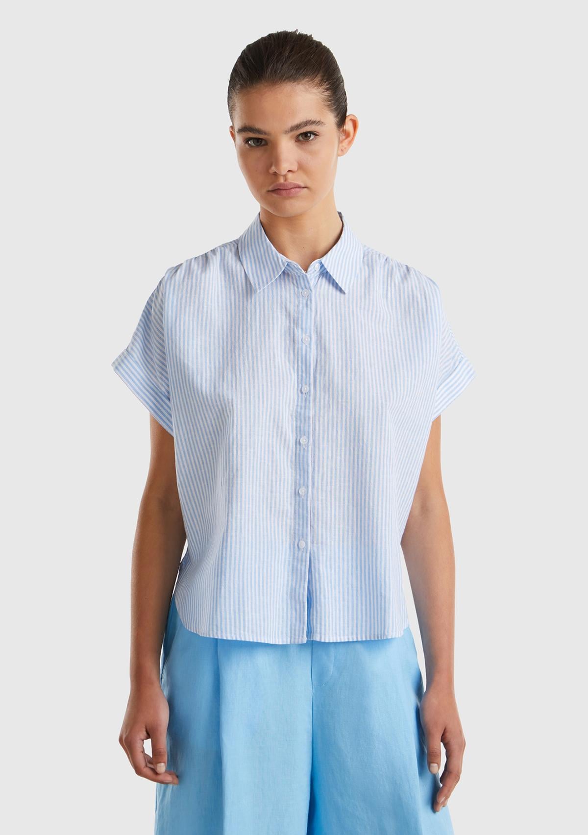Kadın Mavi Pamuk Karışımlı Çizgili Arkası Uzun Kıvrık Kol Gömlek