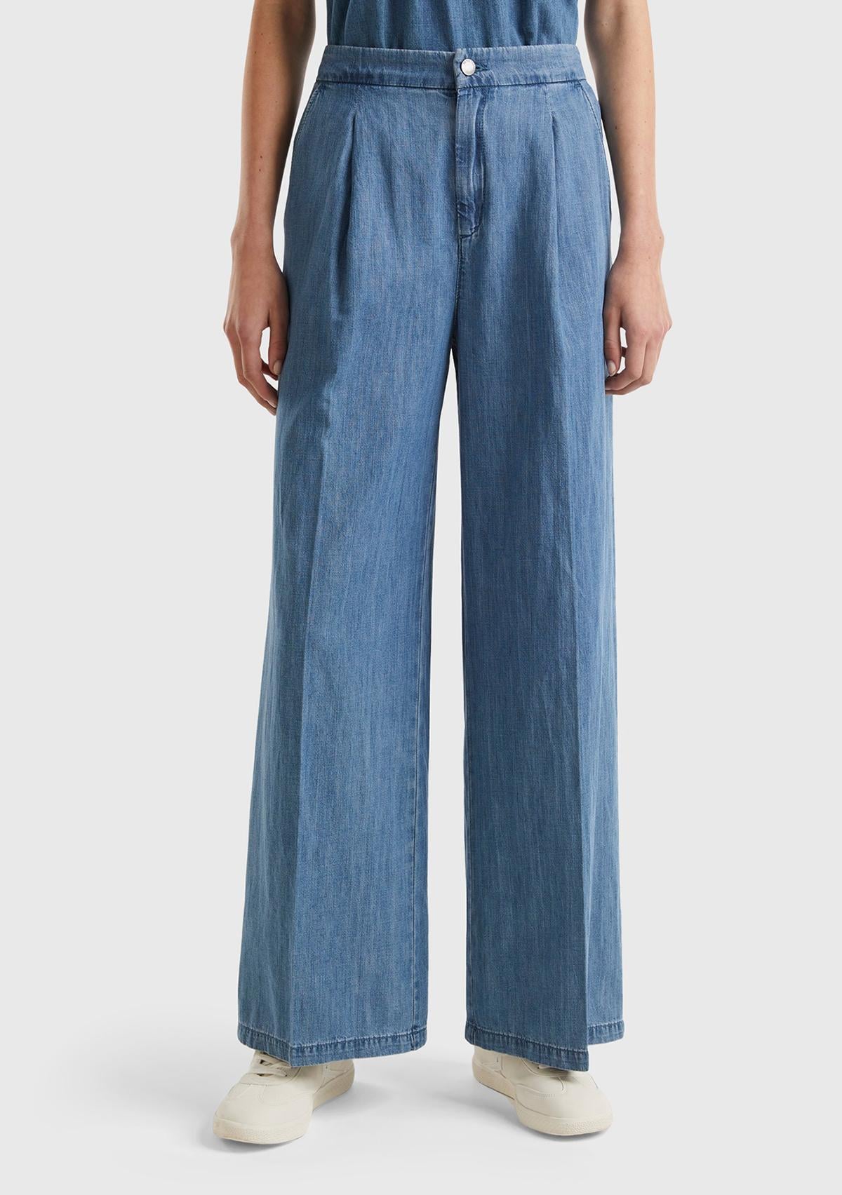 Kadın Mavi Pamuk Karışımlı Önü Pileli Beli Büzgülü Fermuarlı Pantolon