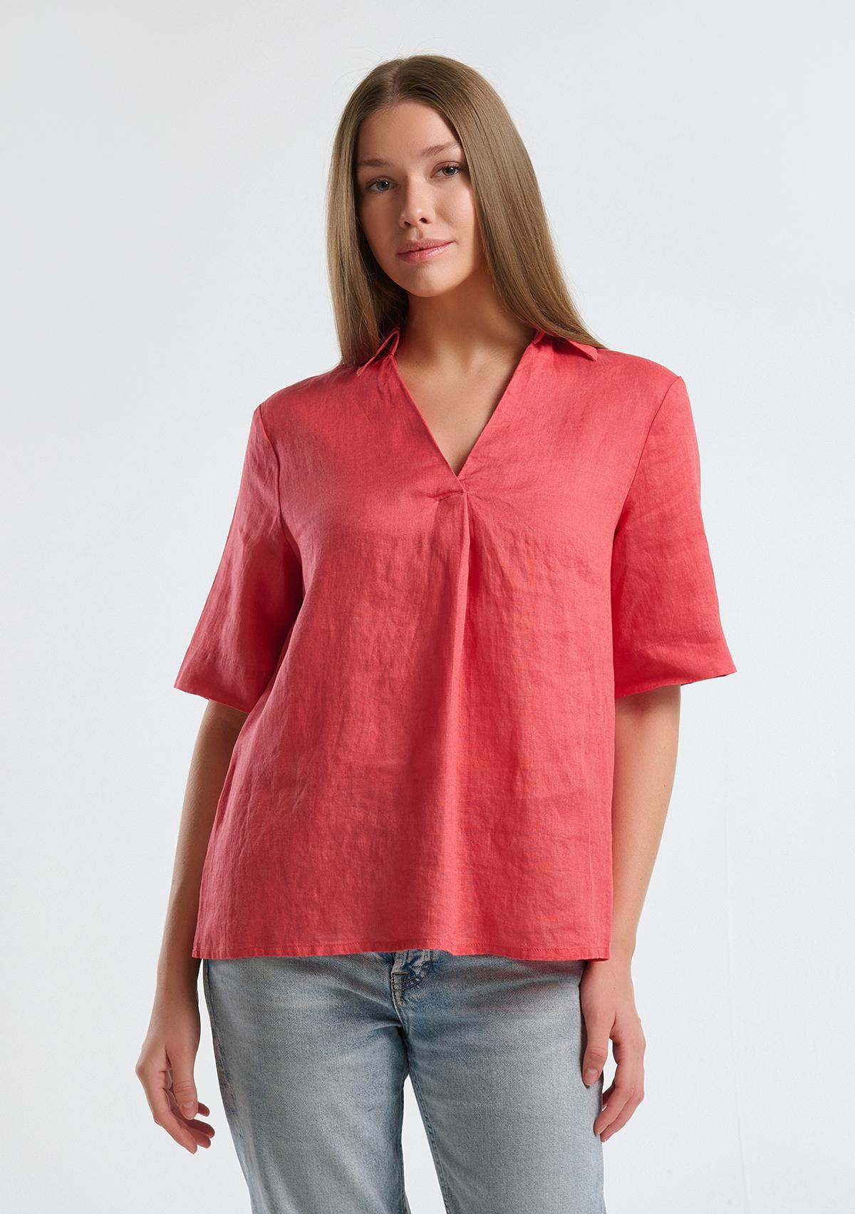 Kadın Mercan %100 Keten Relax Fit V Gömlek Yakalı Kısa Kollu Bluz