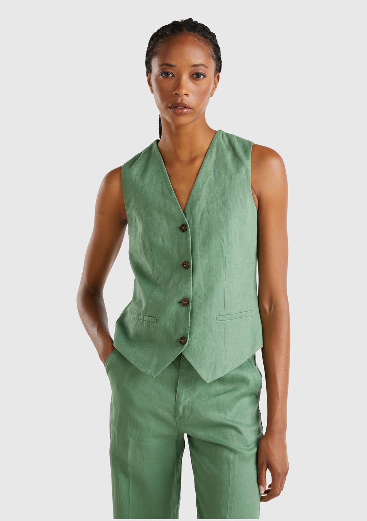 Kadın Mint Yeşili %100 Keten Önü Düğme İliklemeli V Yaka Yelek