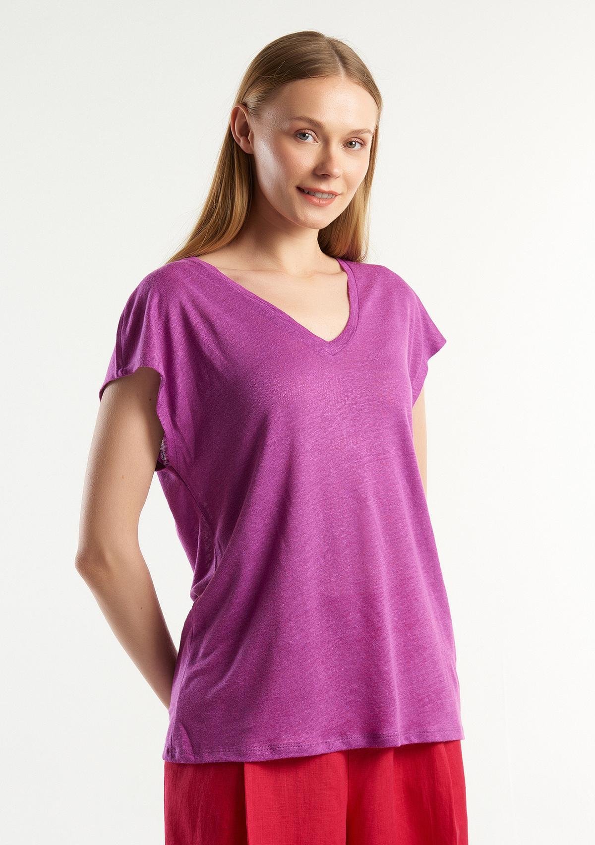 Kadın Mor %100 Keten Rahat Kalıp Derin V Yaka Kolsuz T-Shirt