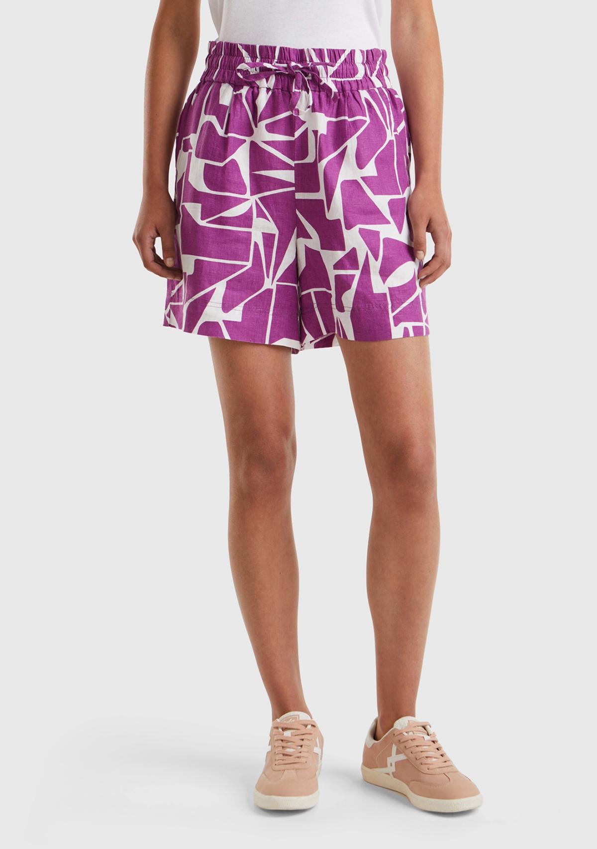 Kadın Mor %100 Keten Tamamı Desenli Beli Bağlamalı Şort