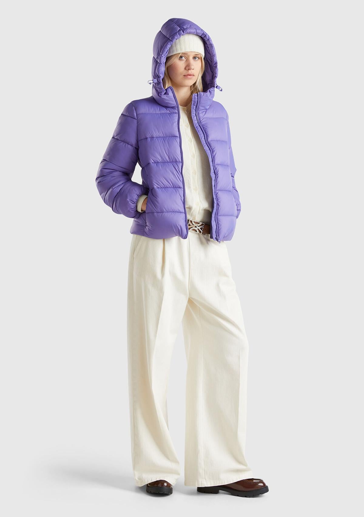Kadın Mor Önü Cepli Fermuar Kapamalı Büzgü Kapüşonlu Mont