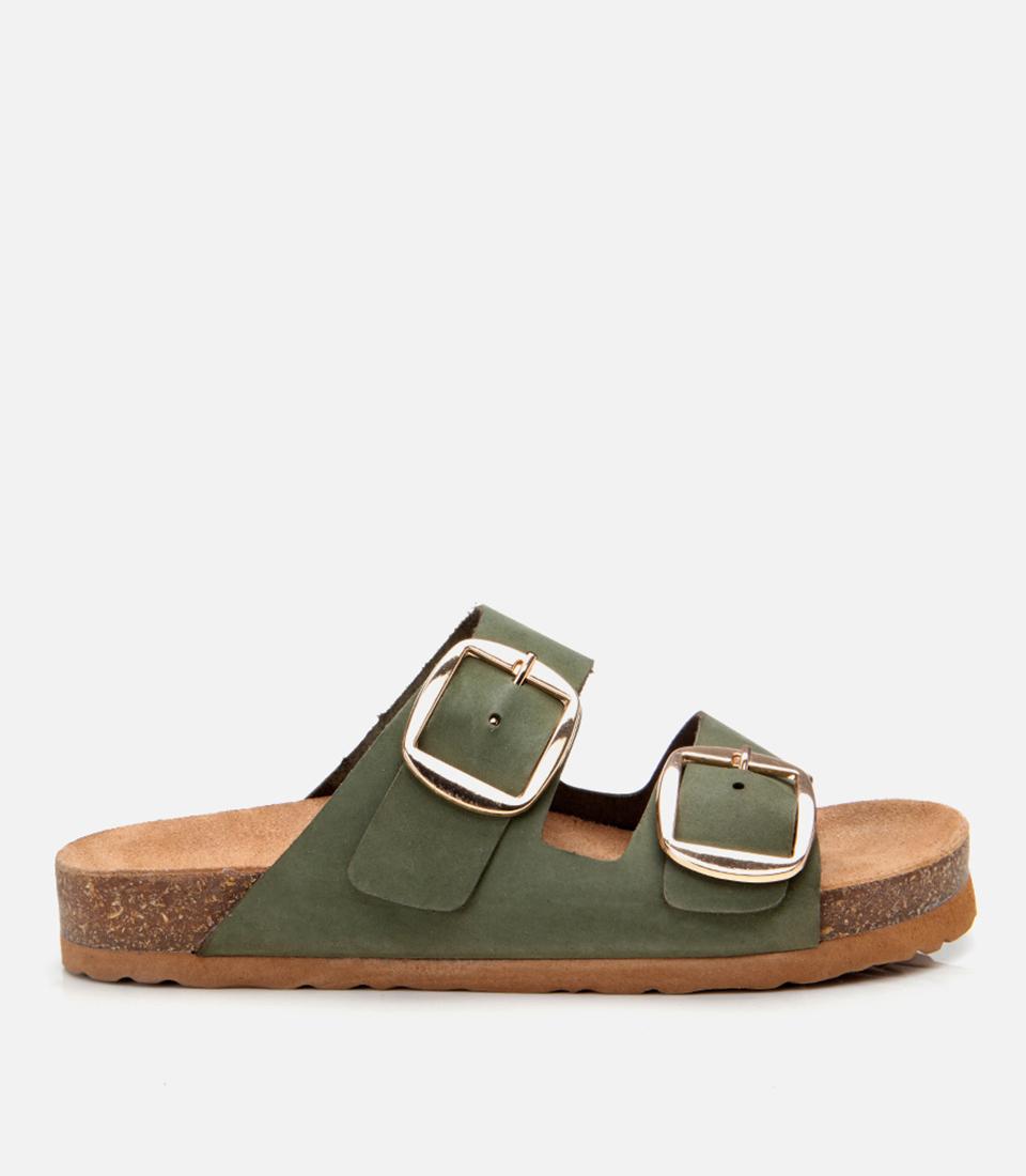 Kadın Nubuk Deri Yeşil Kemerli Düz Terlik