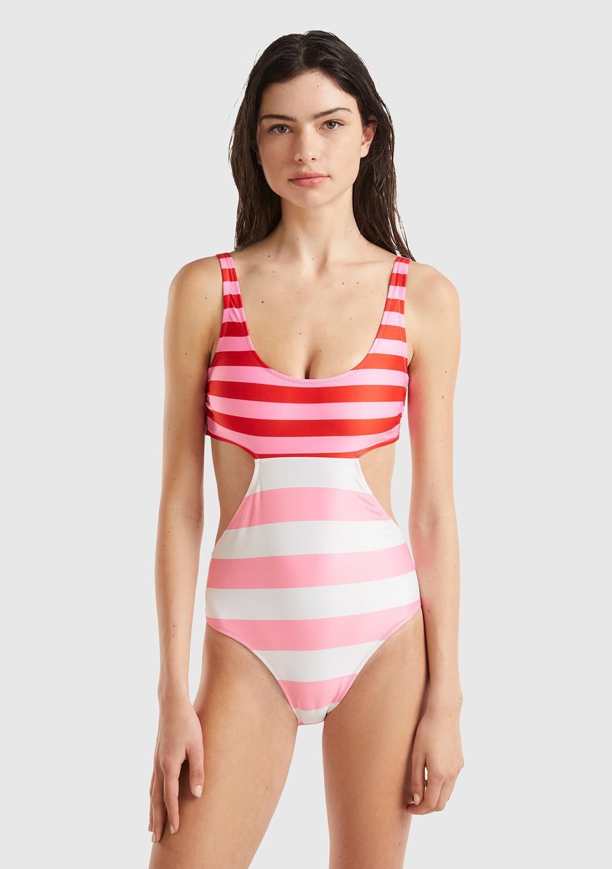 Kadın Pembe Mix Bel ve Sırt Detaylı İki Renkli Çizgili Mayo
