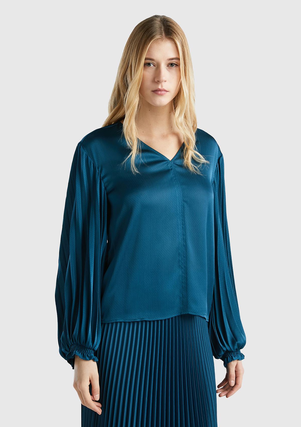 Kadın Petrol Mavisi Kolları Detaylı V Yaka Bluz