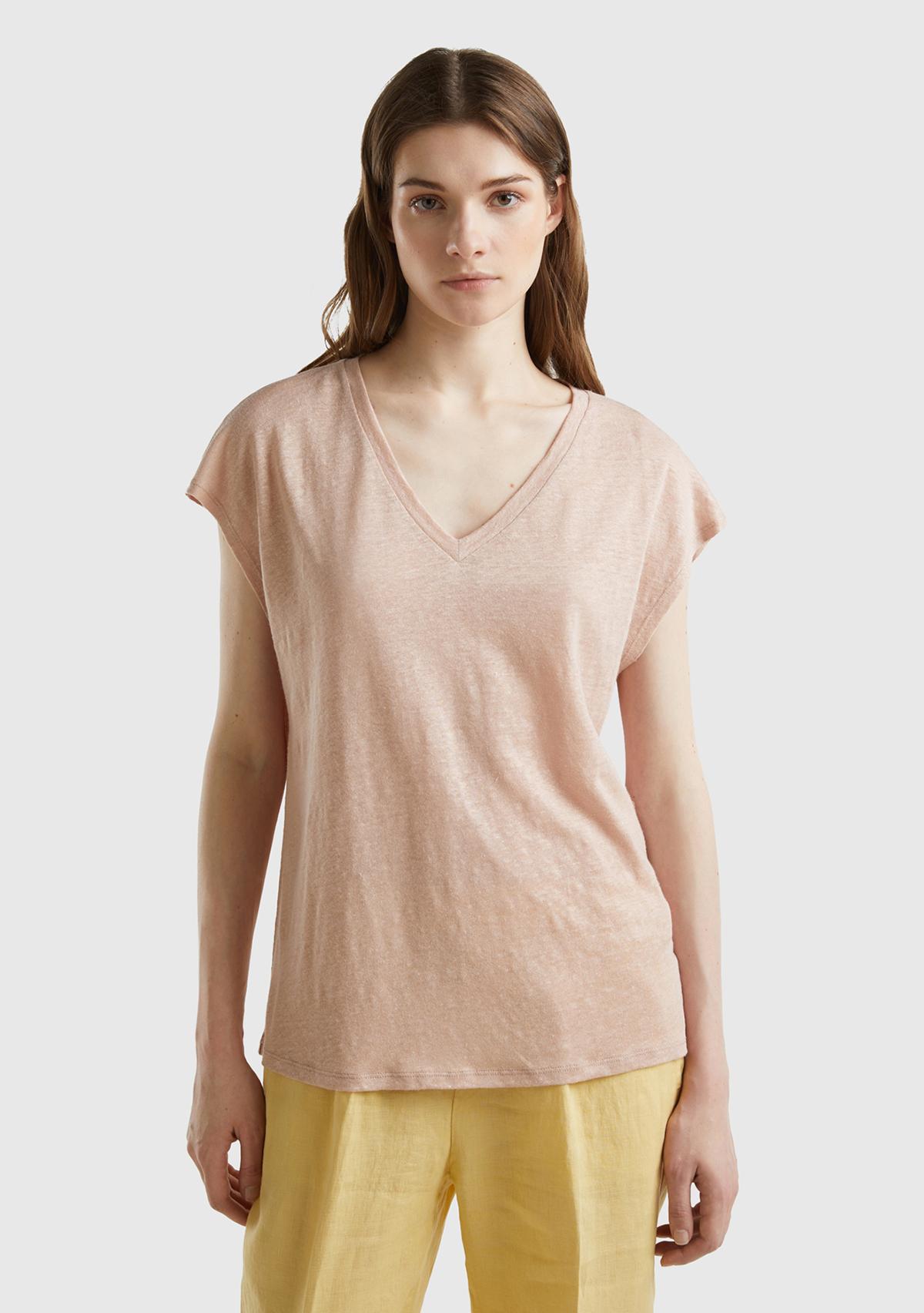 Kadın Pudra %100 Keten Rahat Kalıp Derin V Yaka Kolsuz T-Shirt