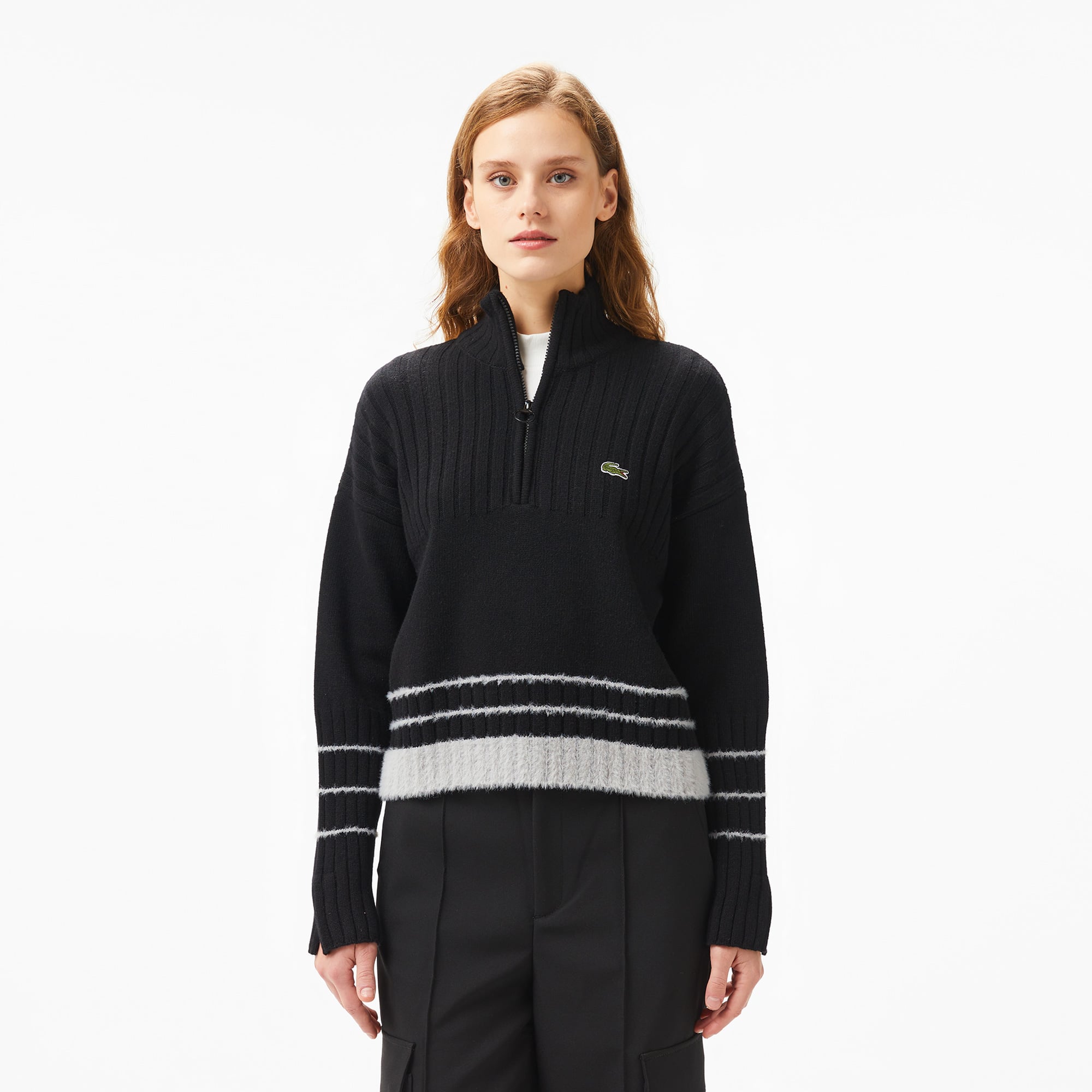 Kadın Regular Fit Yarım Fermuarlı Renk Bloklu Siyah Kazak