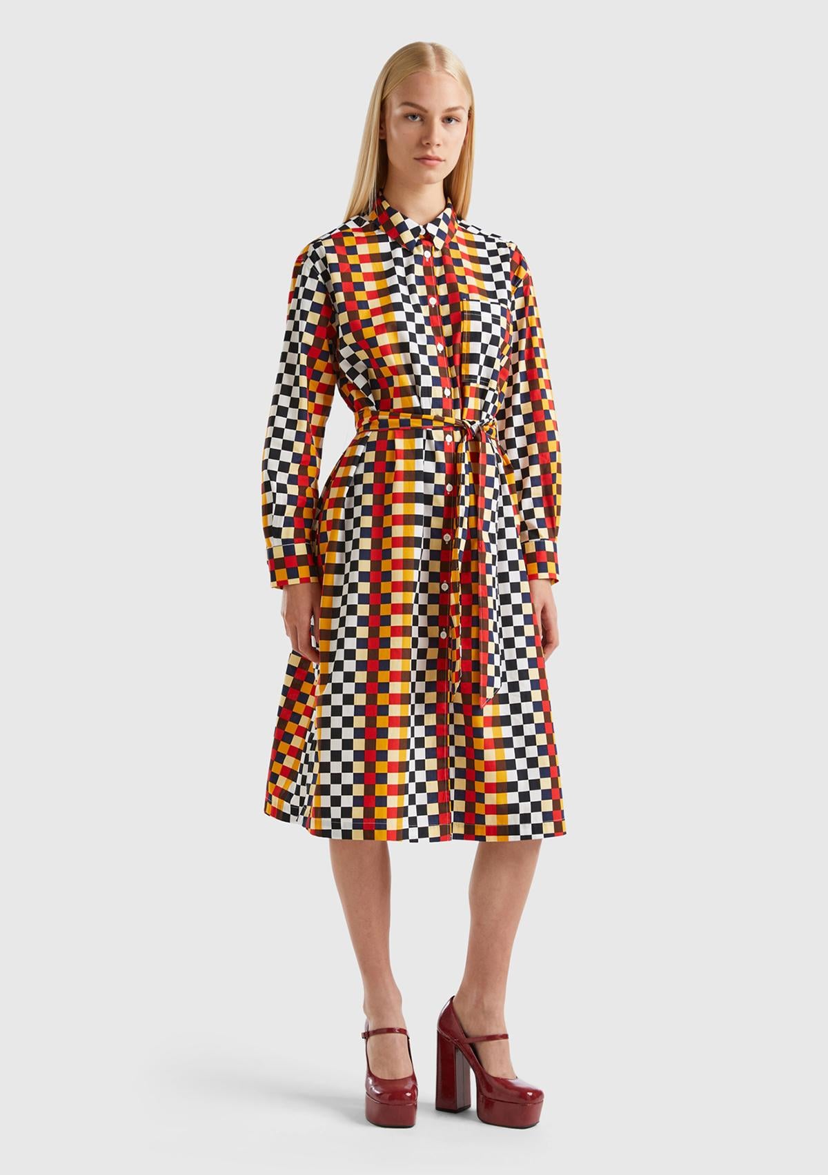 Kadın Renkli Renkli Dama Desenli Gömlek Yaka Poplin Elbise