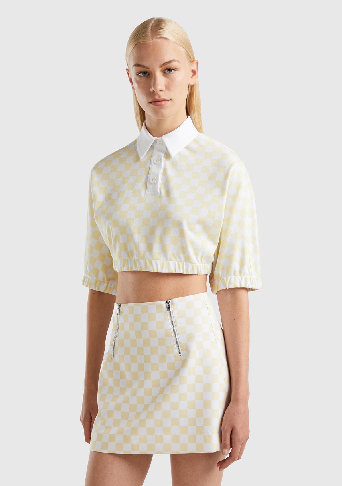 Kadın Sarı Dama Desenli Kısa Kollu Crop Koton Gömlek