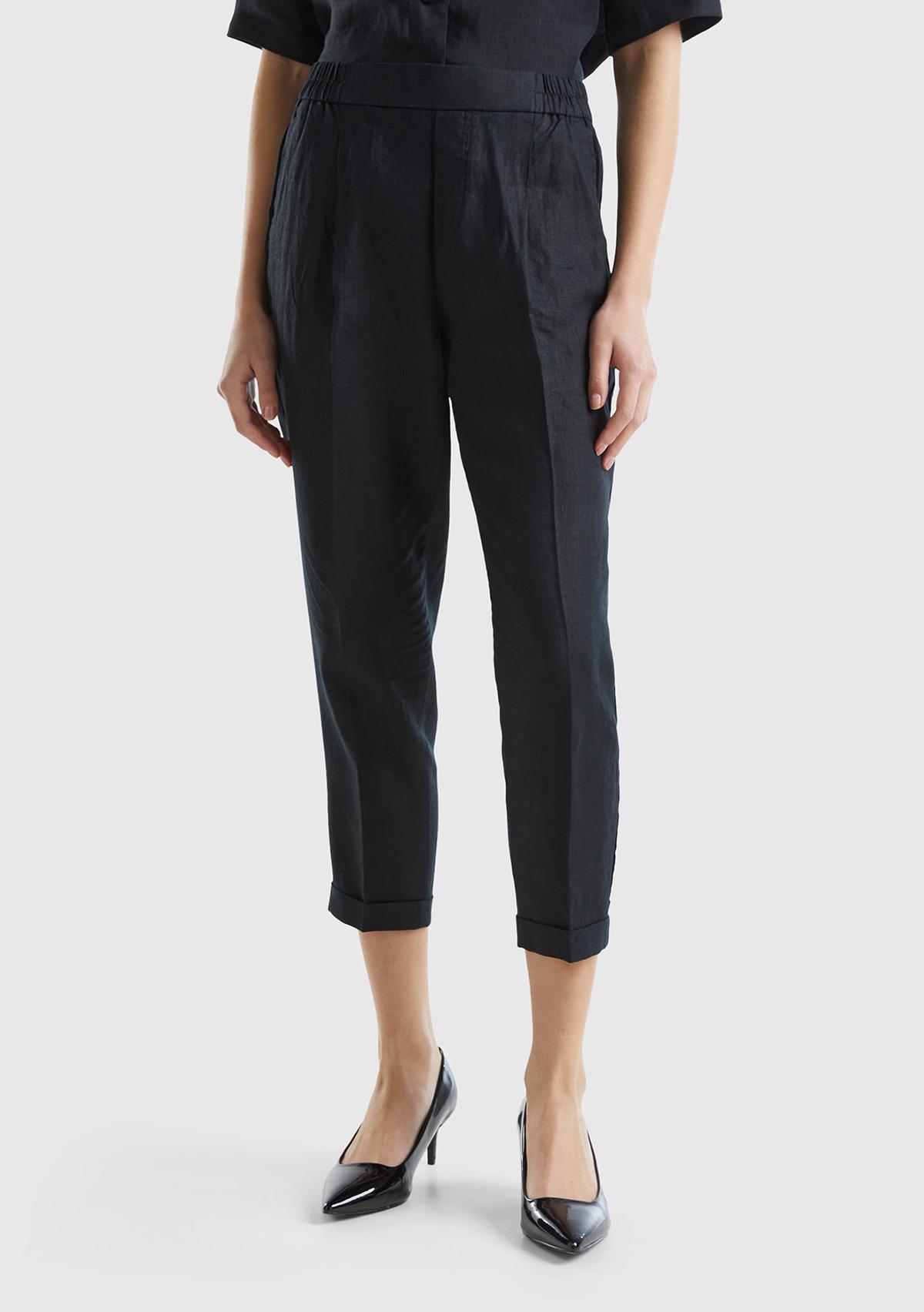 Kadın Siyah %100 Keten Beli Lastikli Pantolon