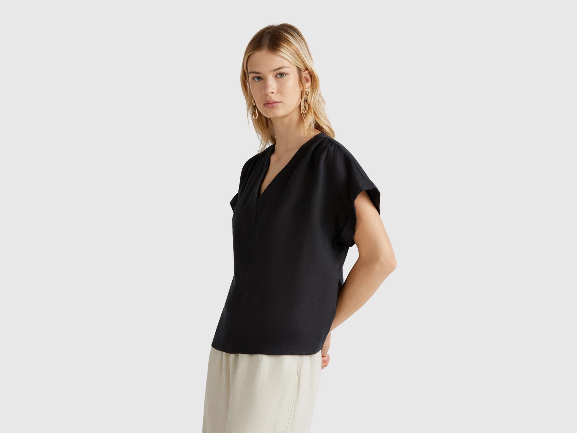 Kadın Siyah %100 Keten Kimono Kol V Yaka Bluz