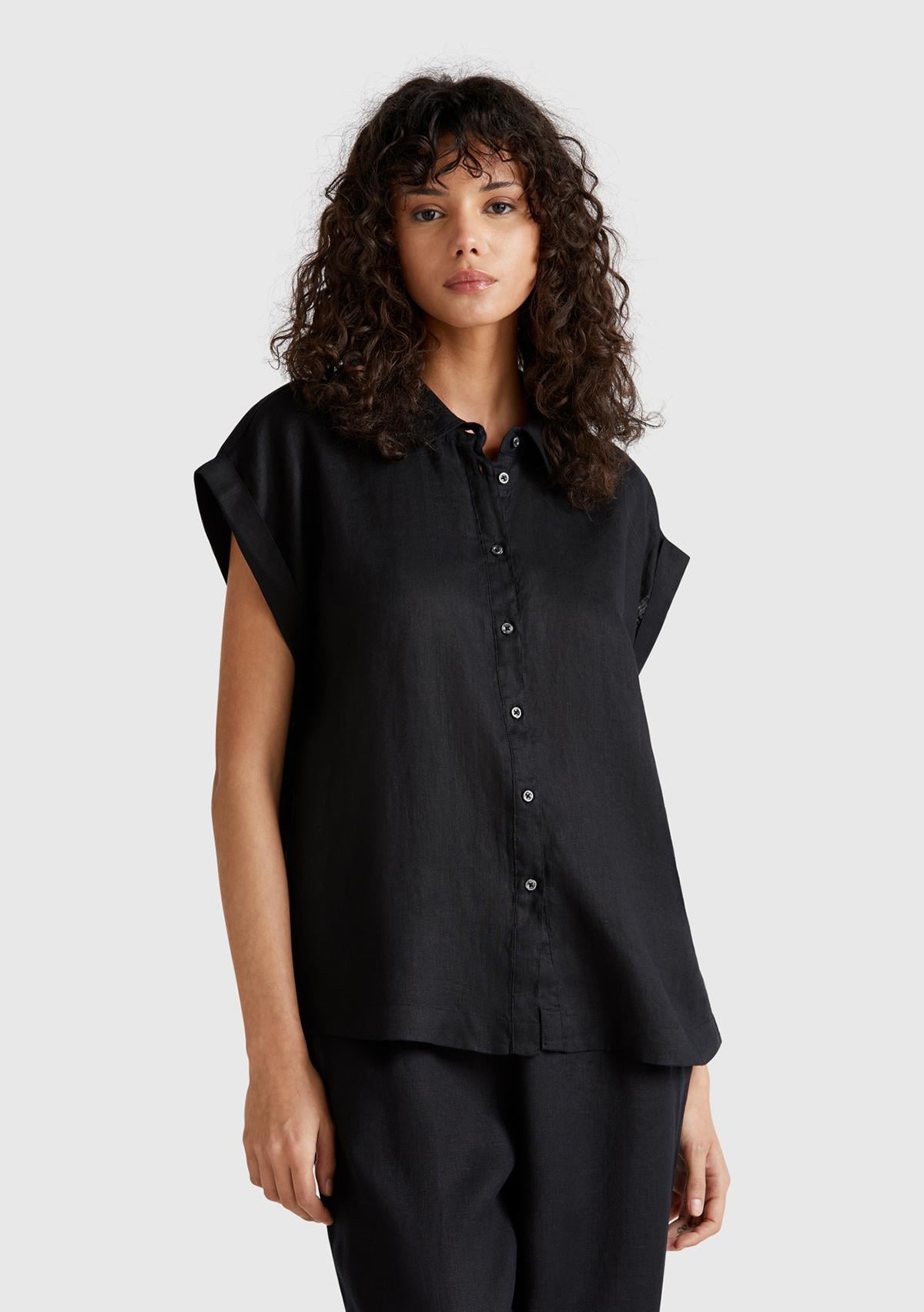 Kadın Siyah %100 Keten Omuz Detaylı Kısa Kollu Gömlek