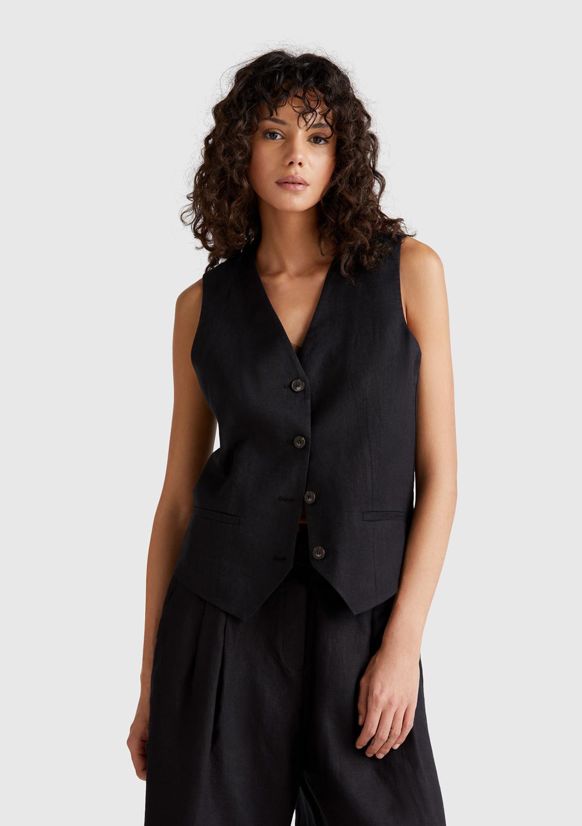 Kadın Siyah %100 Keten Önü Düğme İliklemeli V Yaka Yelek