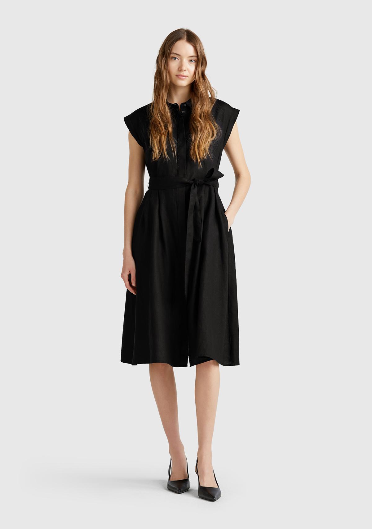 Kadın Siyah %100 Keten Pileli Çıkarılabilir Kuşaklı Gömlek Elbise