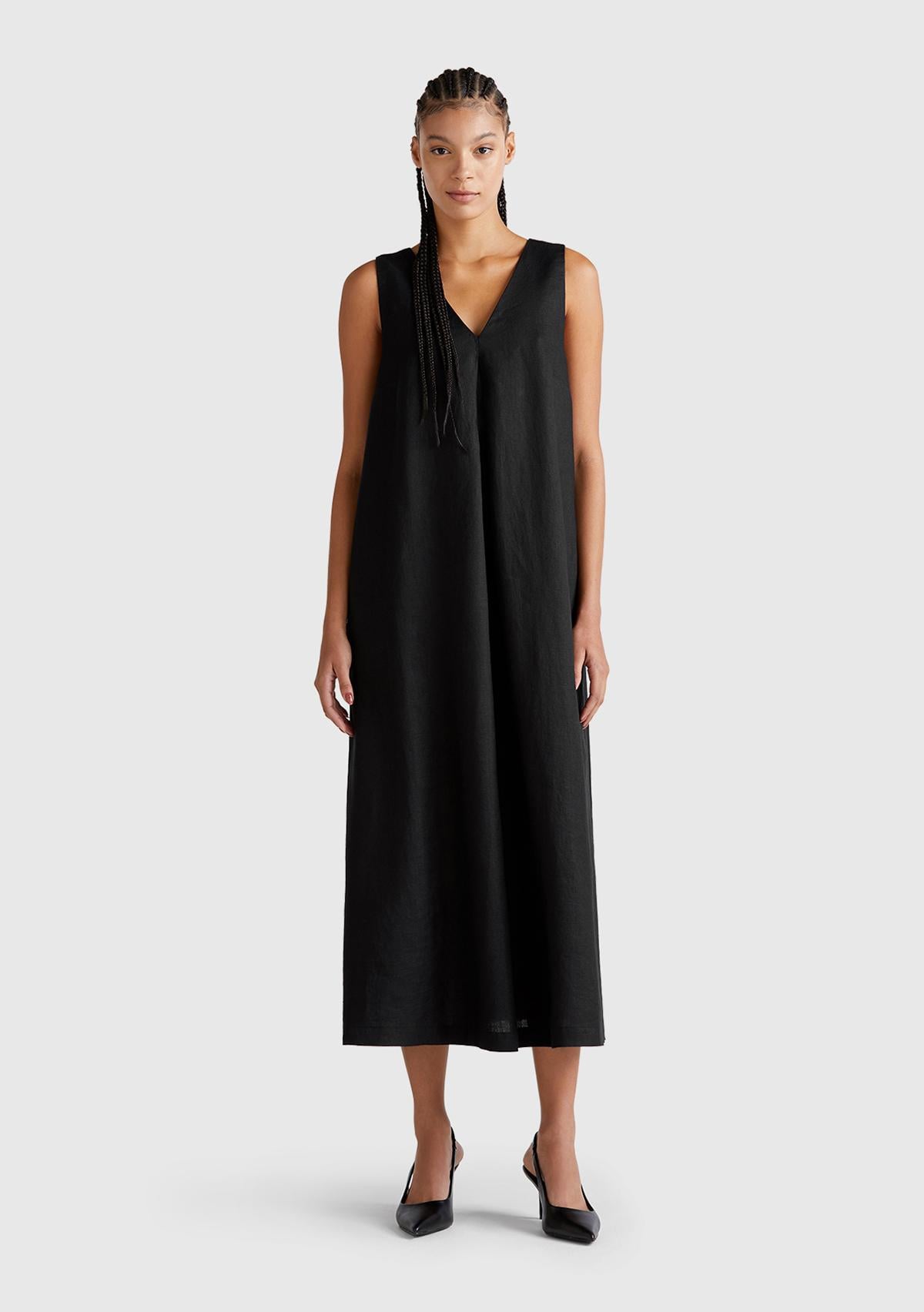 Kadın Siyah %100 Keten V Yaka Kolsuz A Kesim Midi Elbise