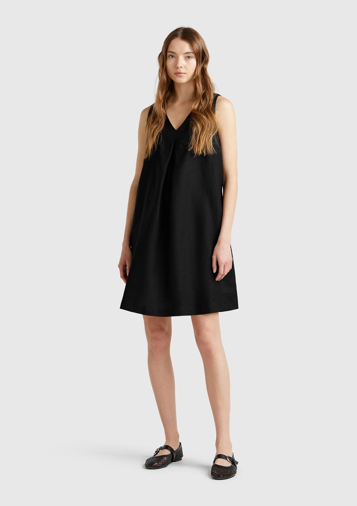 Kadın Siyah %100 Keten Yanı Fermuarlı A Kesim V Yaka Kısa Elbise