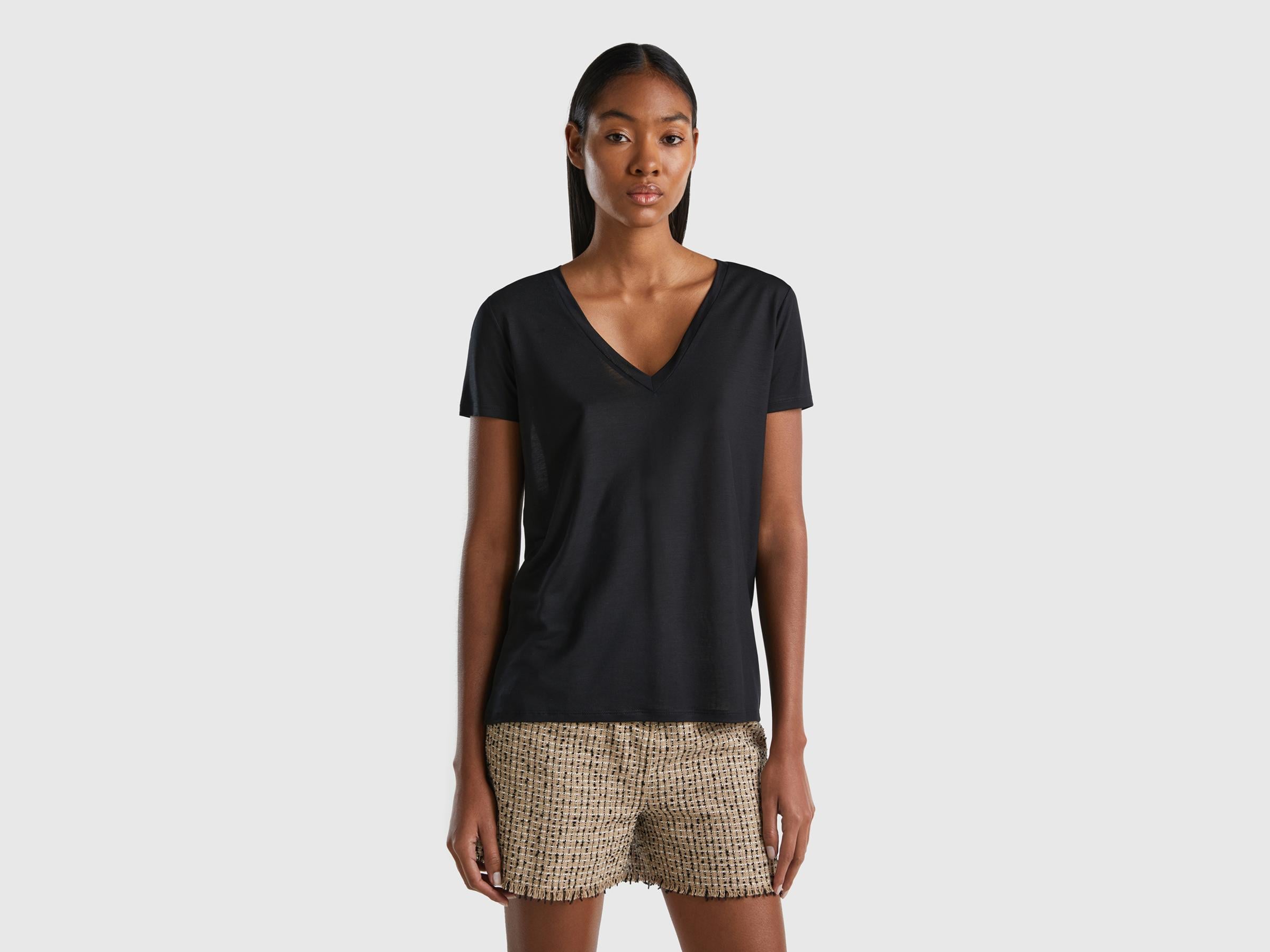 Kadın Siyah %100 Liyosel V Yaka T-Shirt