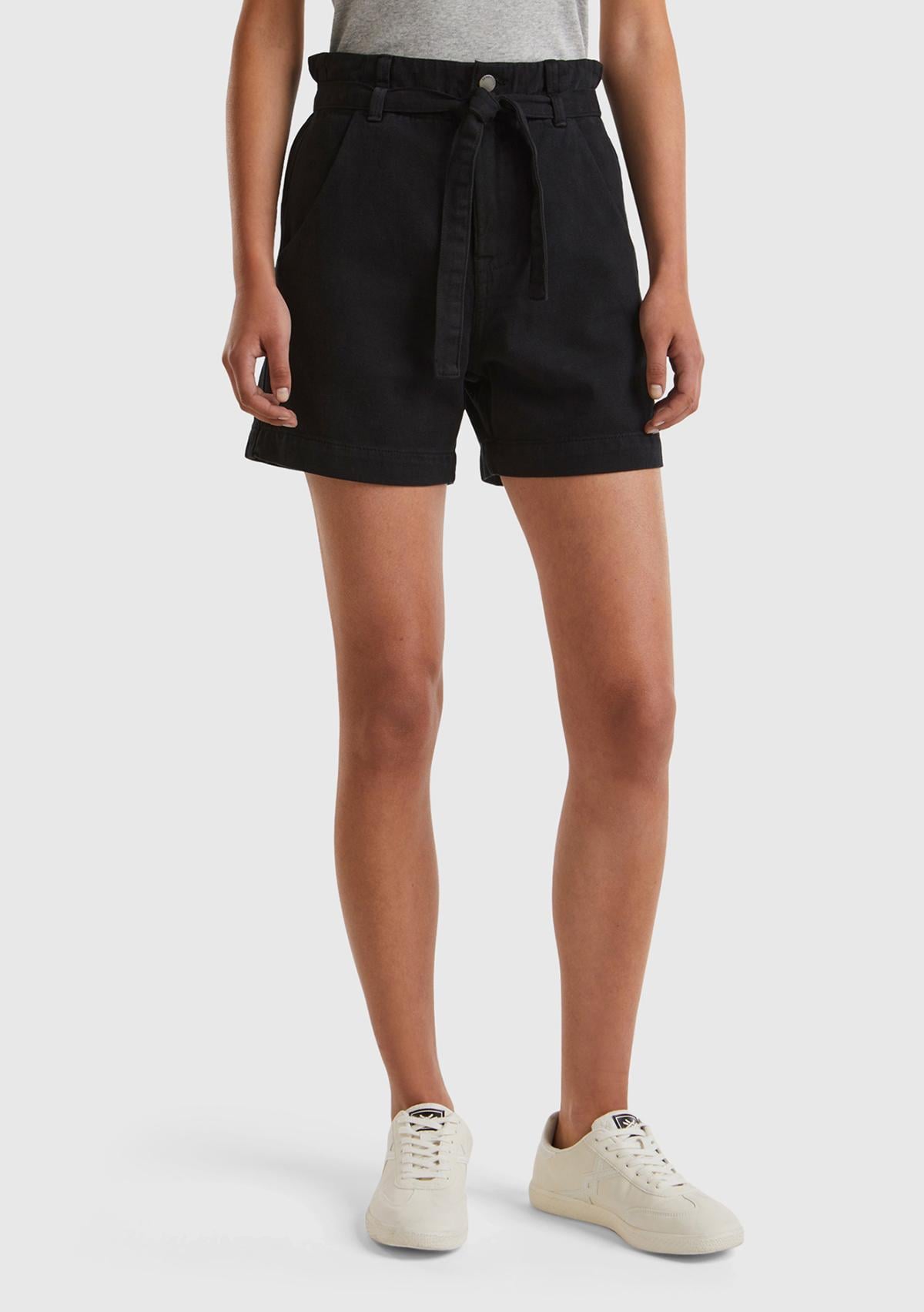 Kadın Siyah %100 Pamuk 2 Cepli Kemer Detaylı Beli Büzgülü Bermuda Şort