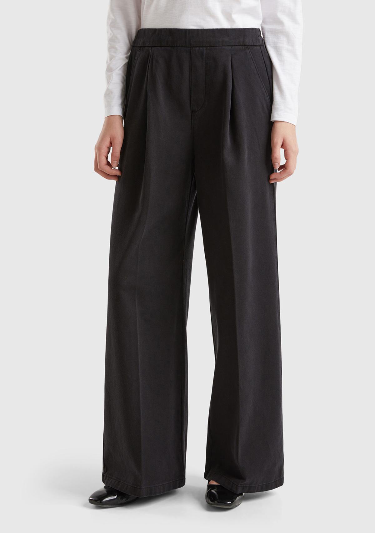 Kadın Siyah %100 Pamuk Arkası Elastik Belli Bol Paça Pantolon