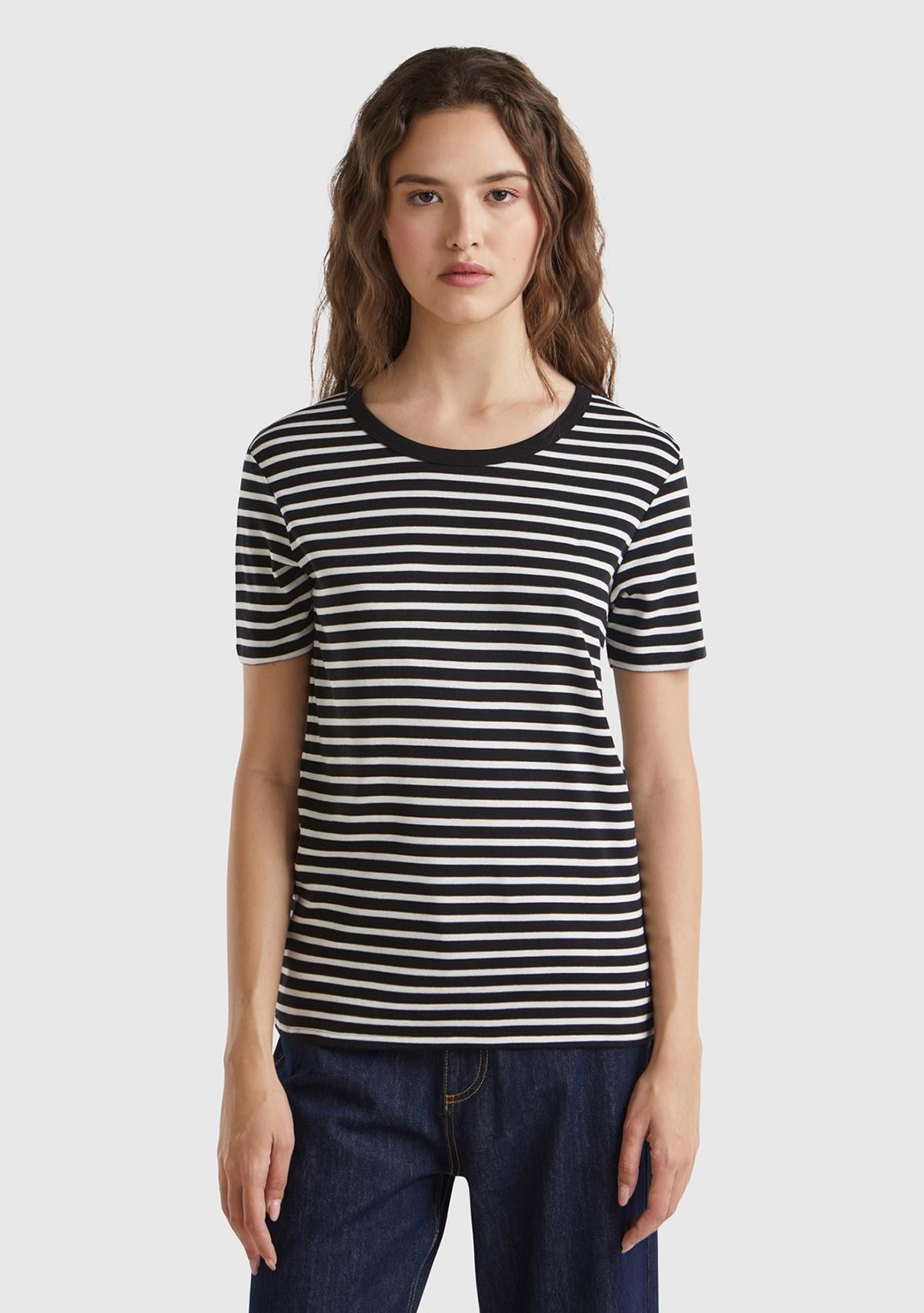 Kadın Siyah %100 Pamuk Sol Altı Logolu Çizgili Yuvarlak Yaka T-Shirt