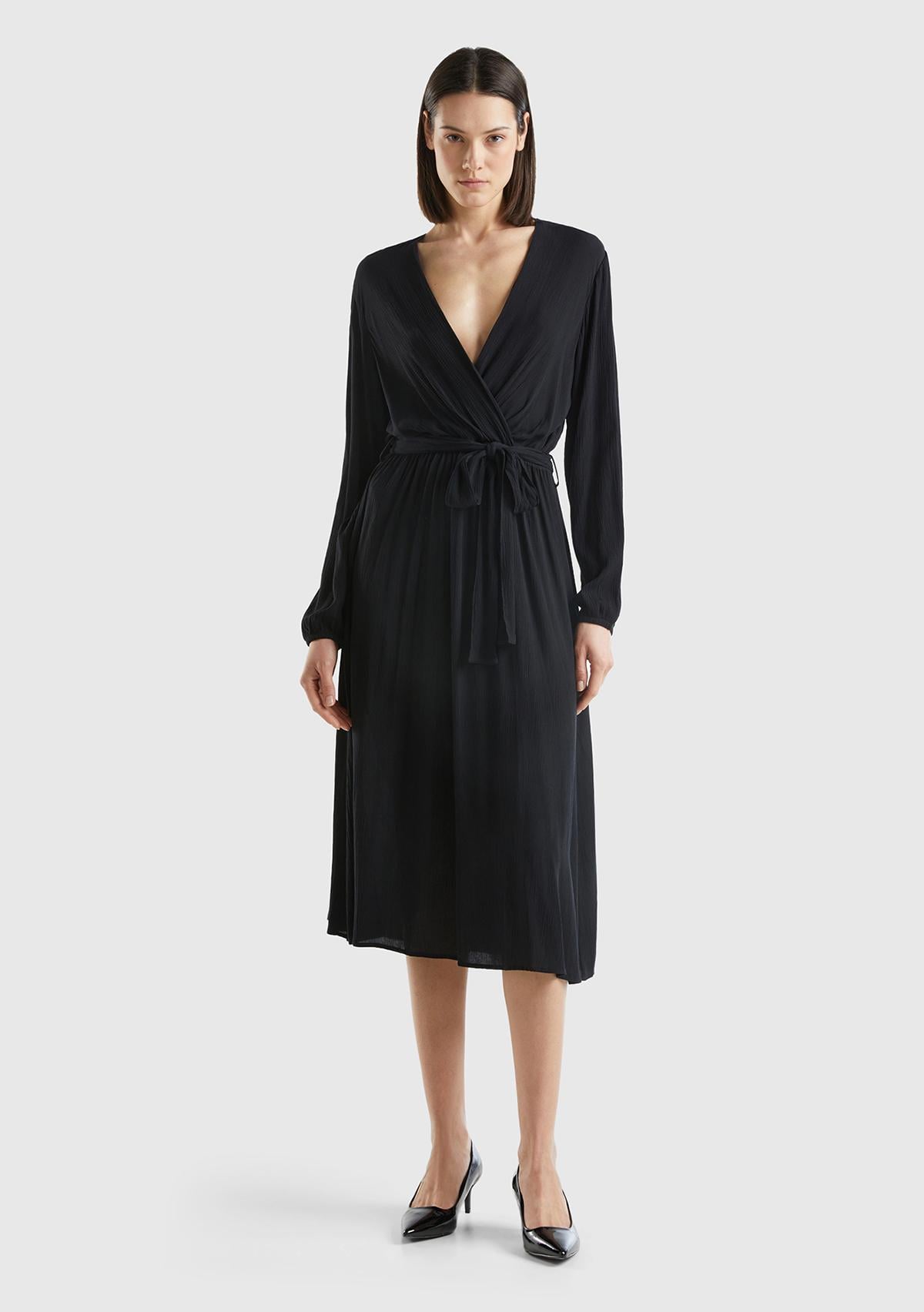 Kadın Siyah %100 Viskoz Beli Kuşaklı Uzun Kollu Kruvaze Elbise