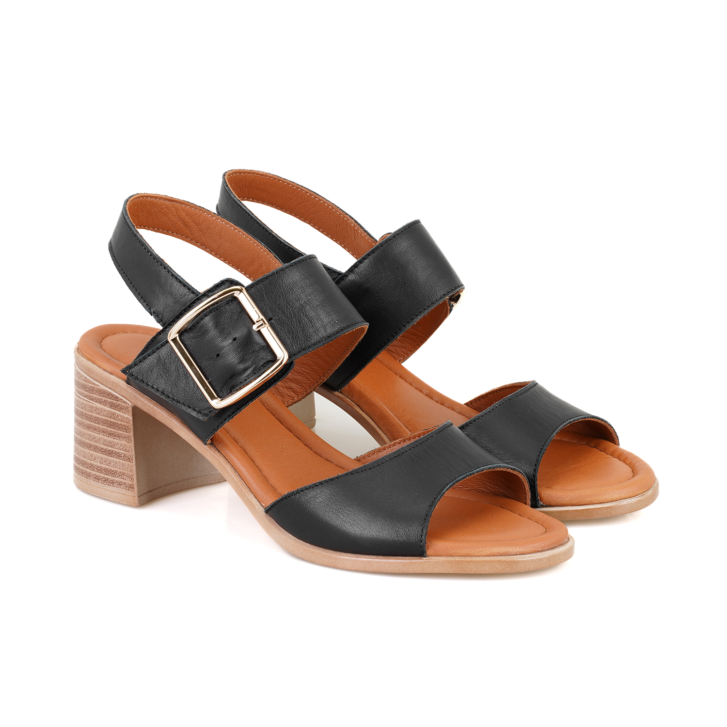 Kadın Siyah Ayarlanabilir Tokalı Topuklu Deri Sandalet