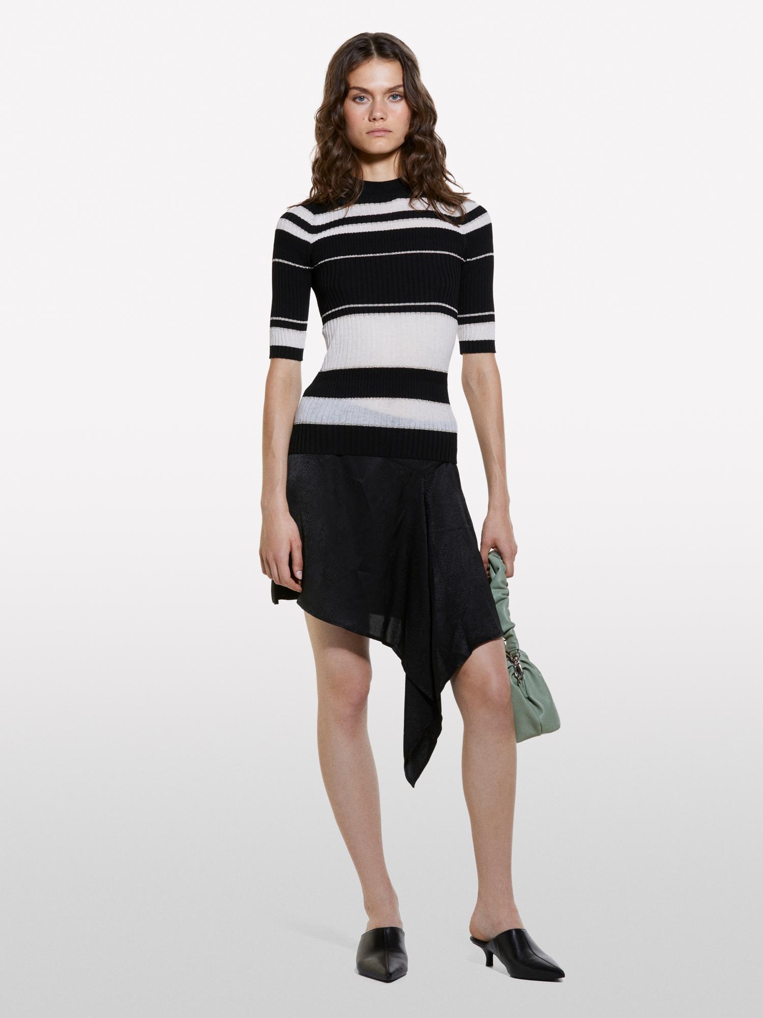 Kadın Siyah Çizgili Viskoz ve Pamuk Karışımlı Çizgi Detaylı Truvakar Kol Kazak