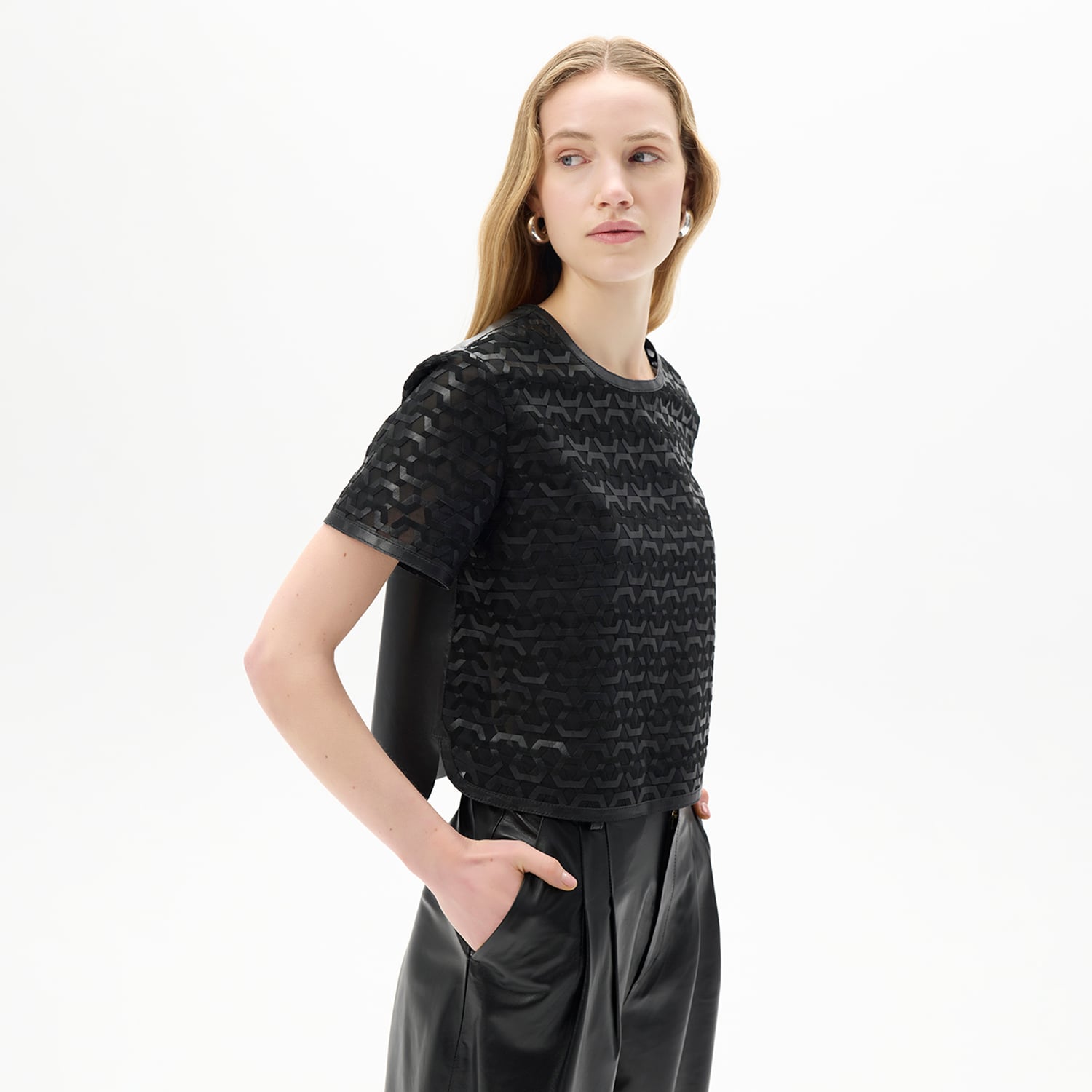 Ön yüzünde özel olarak tül üzerine lamine tekniği ile deri ve süet harmanlaştırarak geometrik şekiller ile hareketlilik verilmiştir.