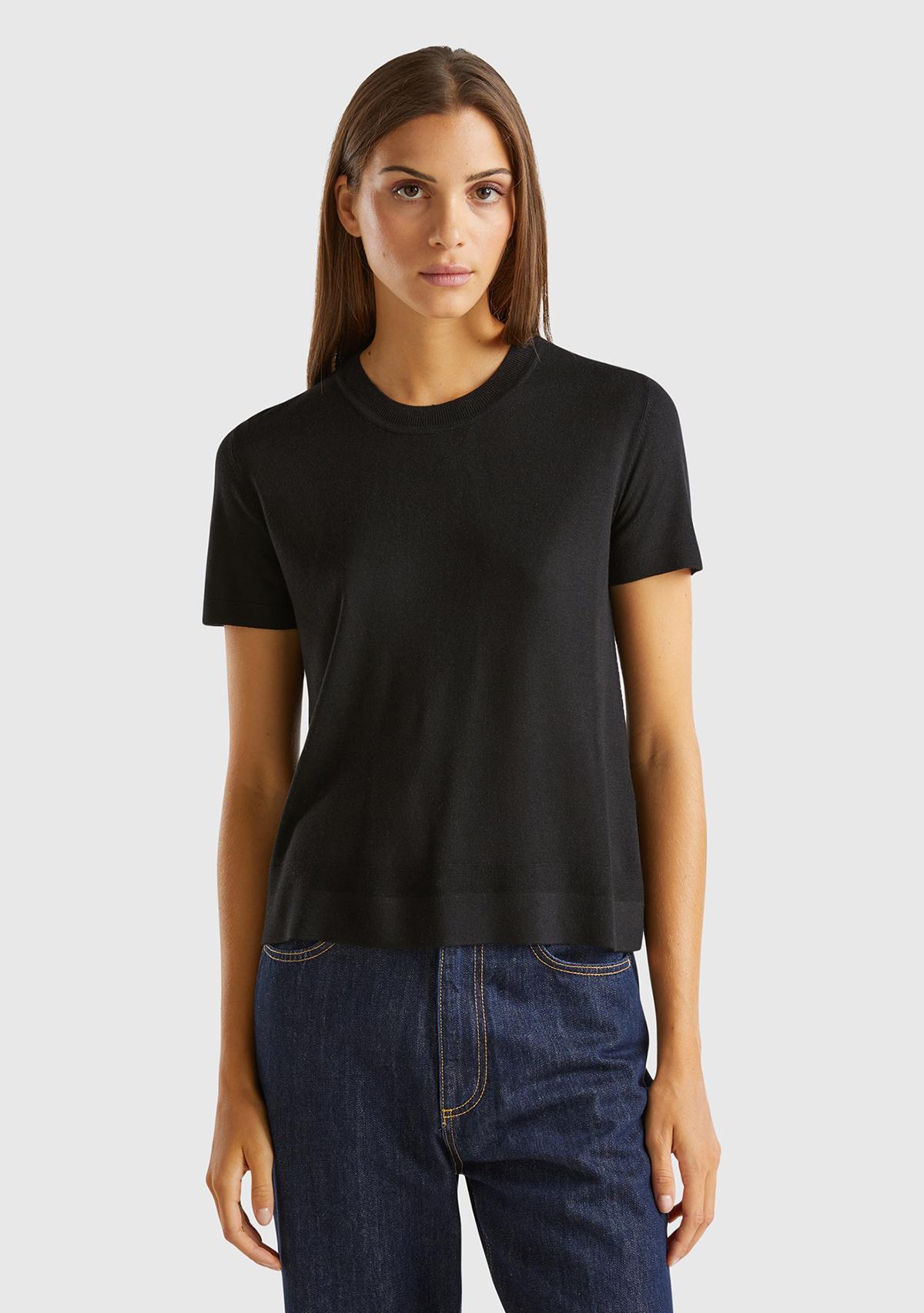 Kadın Siyah İpek Karışımlı Yuvarlak Yaka Önü Detaylı Kısa Kollu Kazak