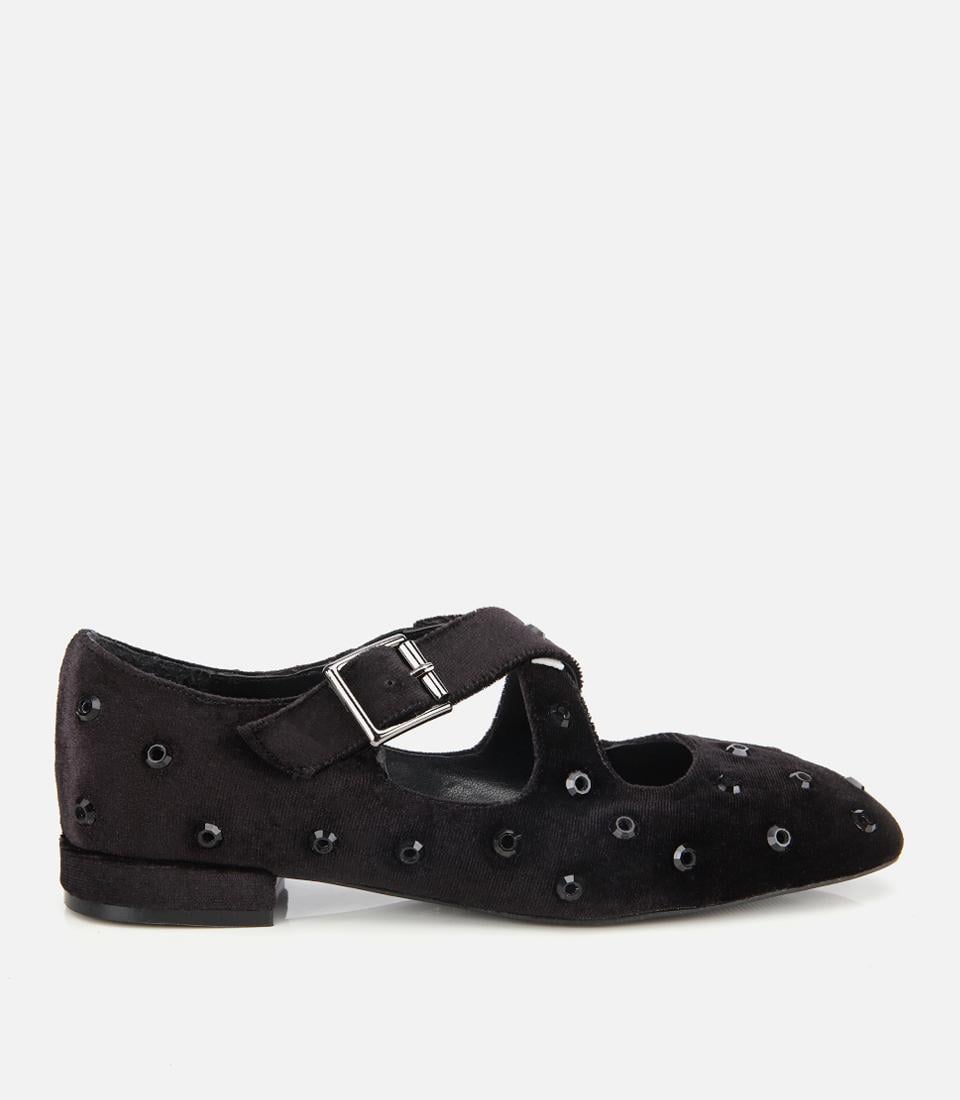 Kadın Siyah Kadife Taşlı Çapraz Bantlı Babet