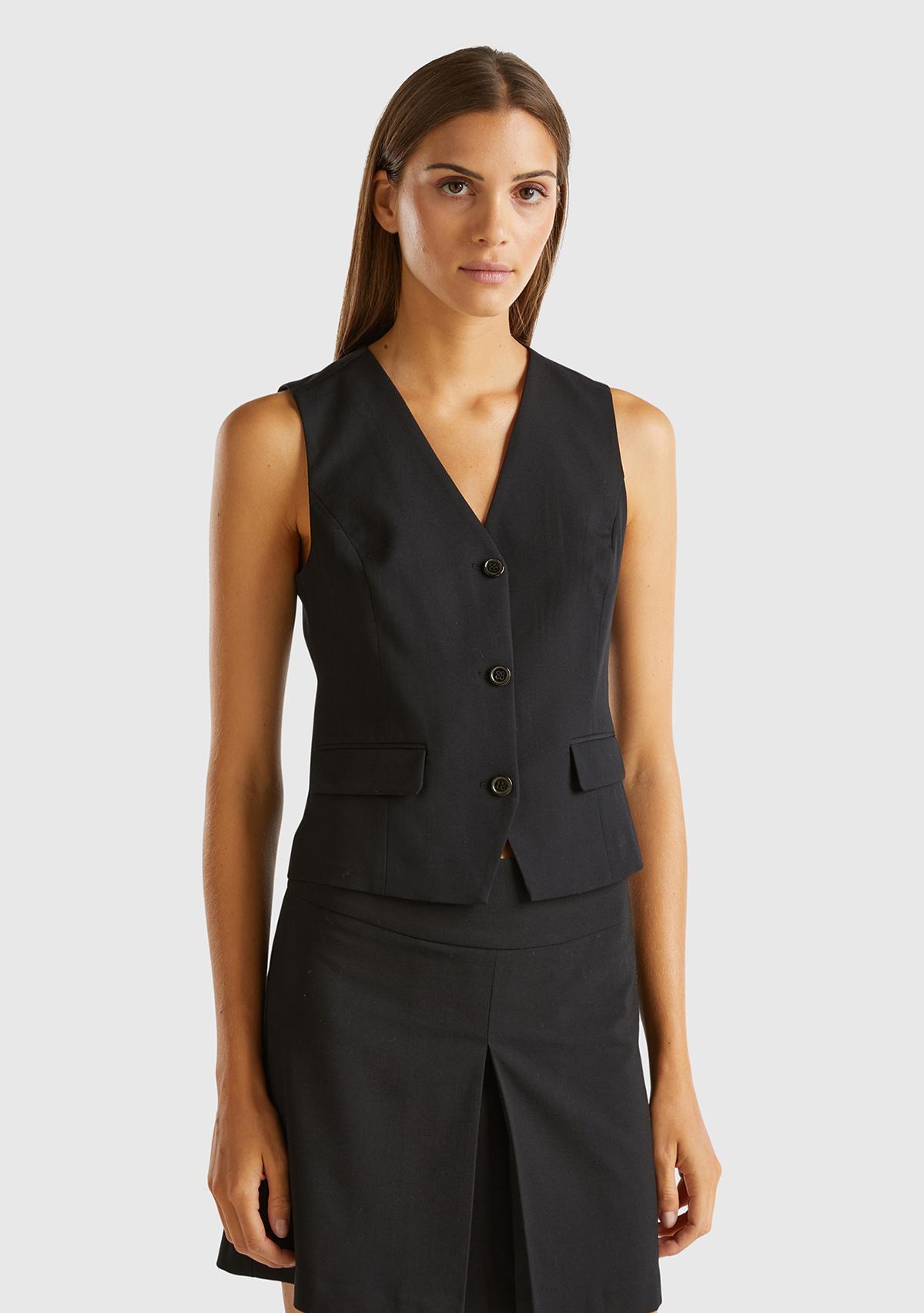 Kadın Siyah Kapaklı Cep Tasarımı 3 Düğmeli V Yaka Yelek