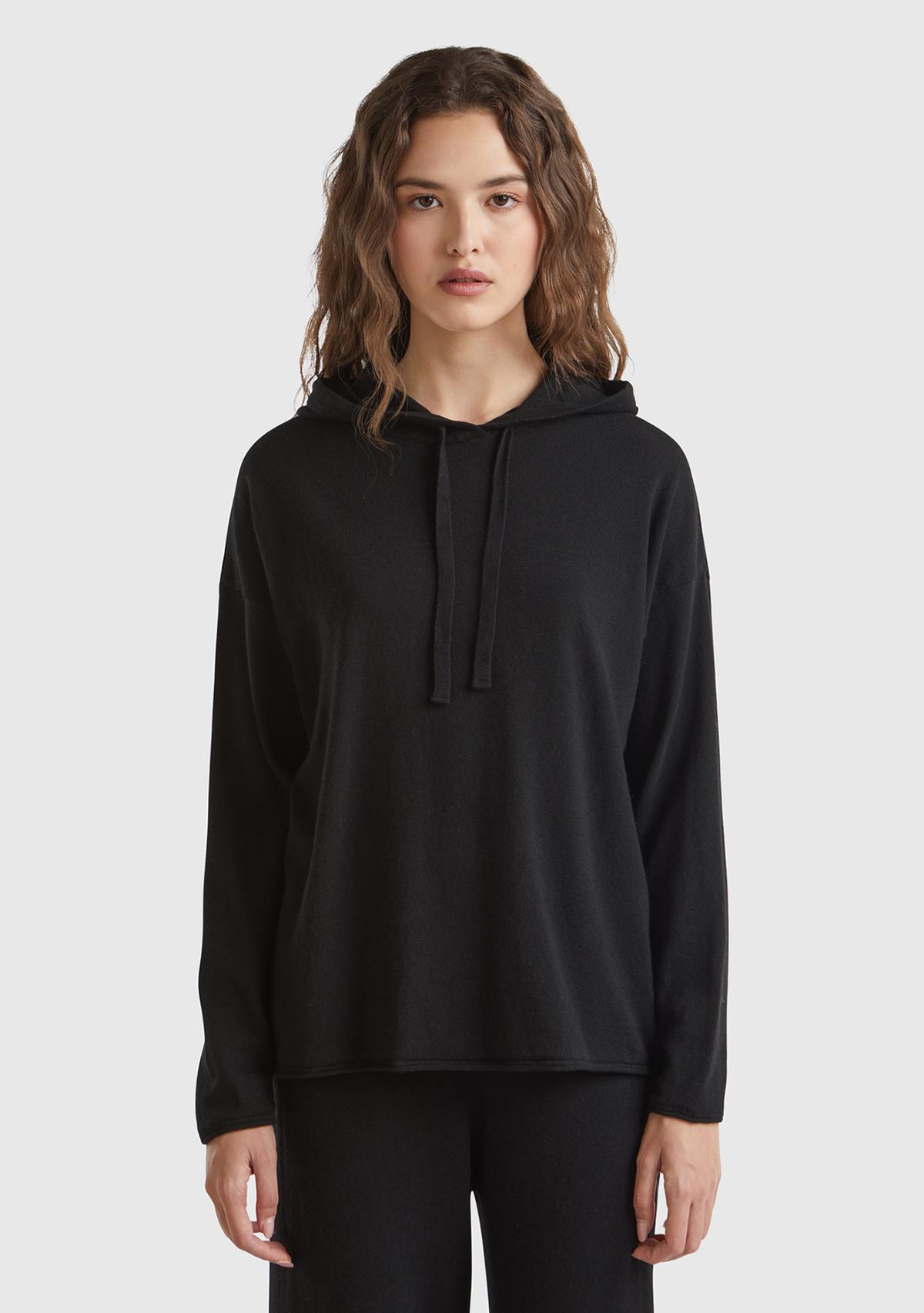 Kadın Siyah Kaşmir Karışımlı Kapşonlu Kazak. Koyun-Keçi Yünü İçerir