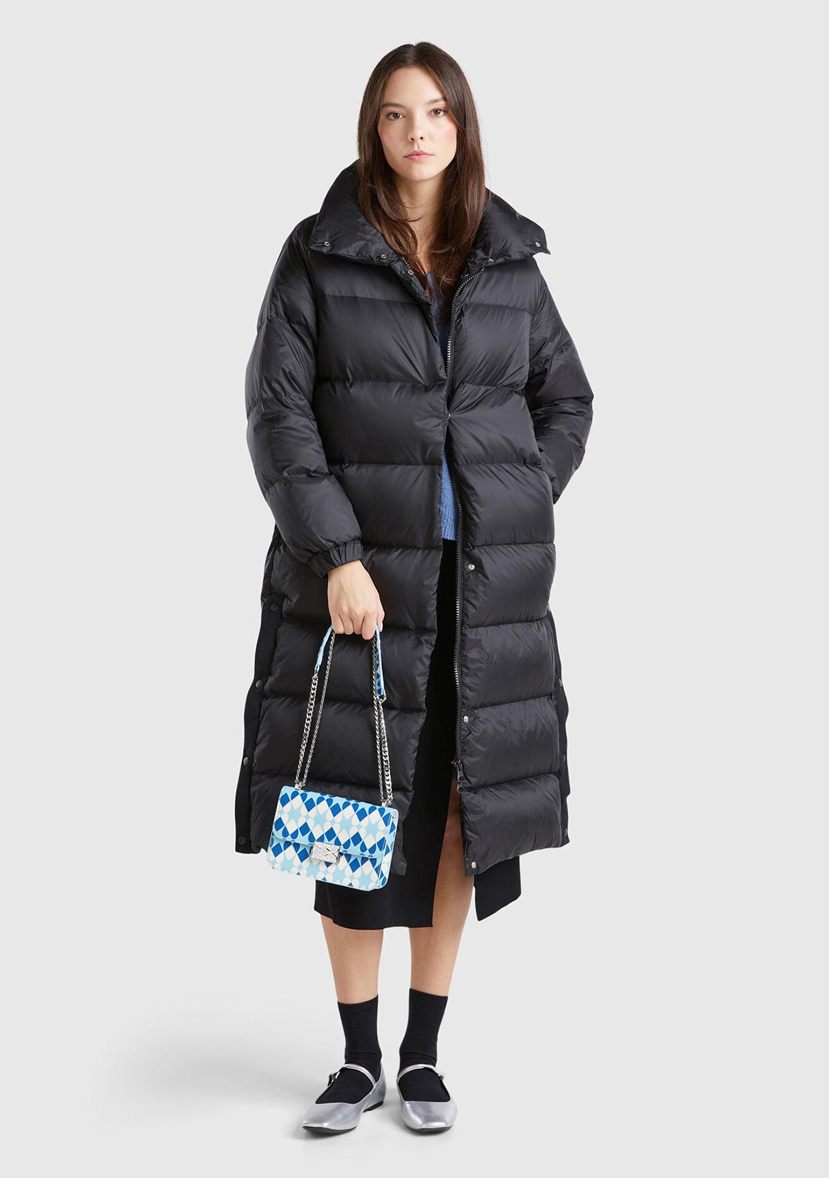 Kadın Siyah Kaz Tüyü Dolgulu Düğme Kapamalı Yüksek Yaka Uzun Şişme Mont