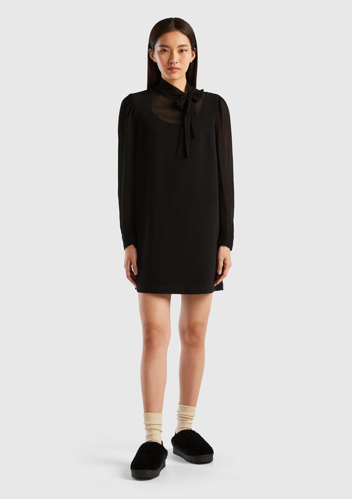 Kadın Siyah Kolu Transparan Yakası Kurdaleli Mini Etek