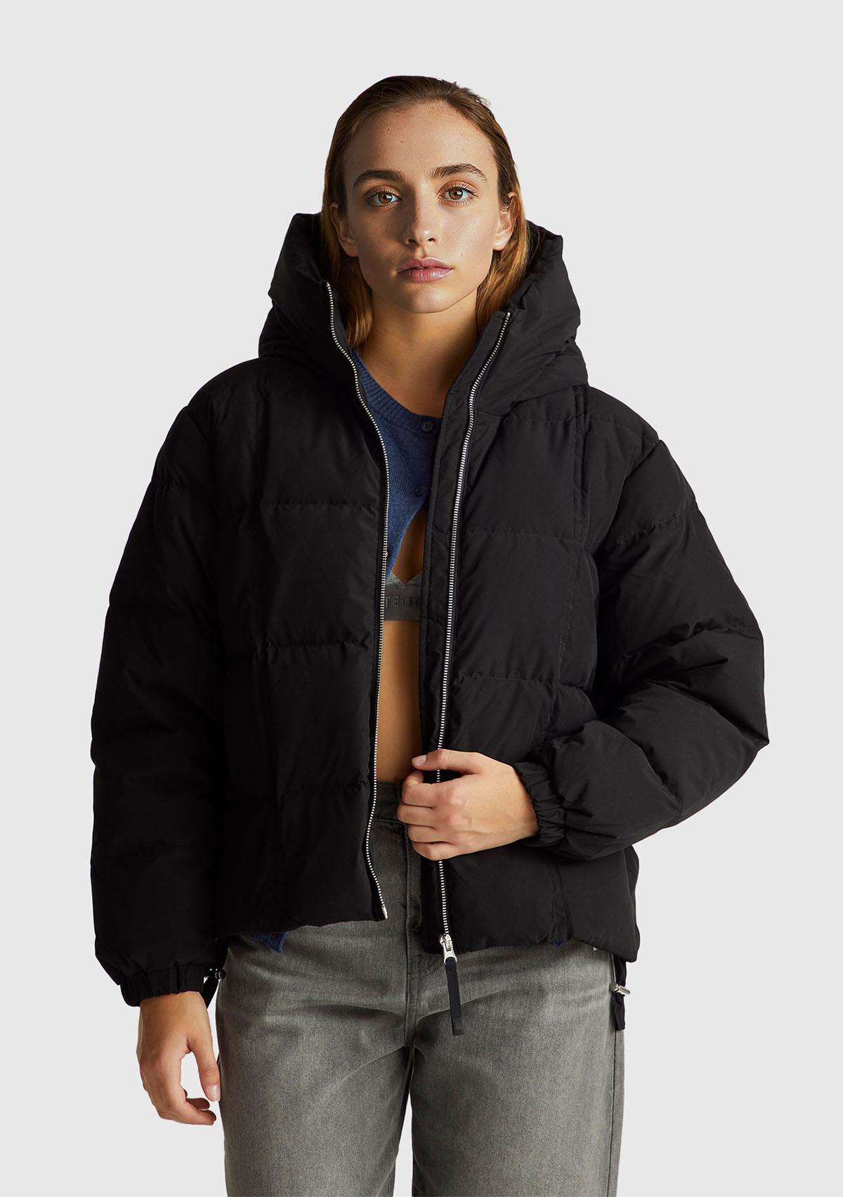 Kadın Siyah Kuş Tüyü Kapüşonlu Fermuarlı Kolu Lastikli Şişme Mont