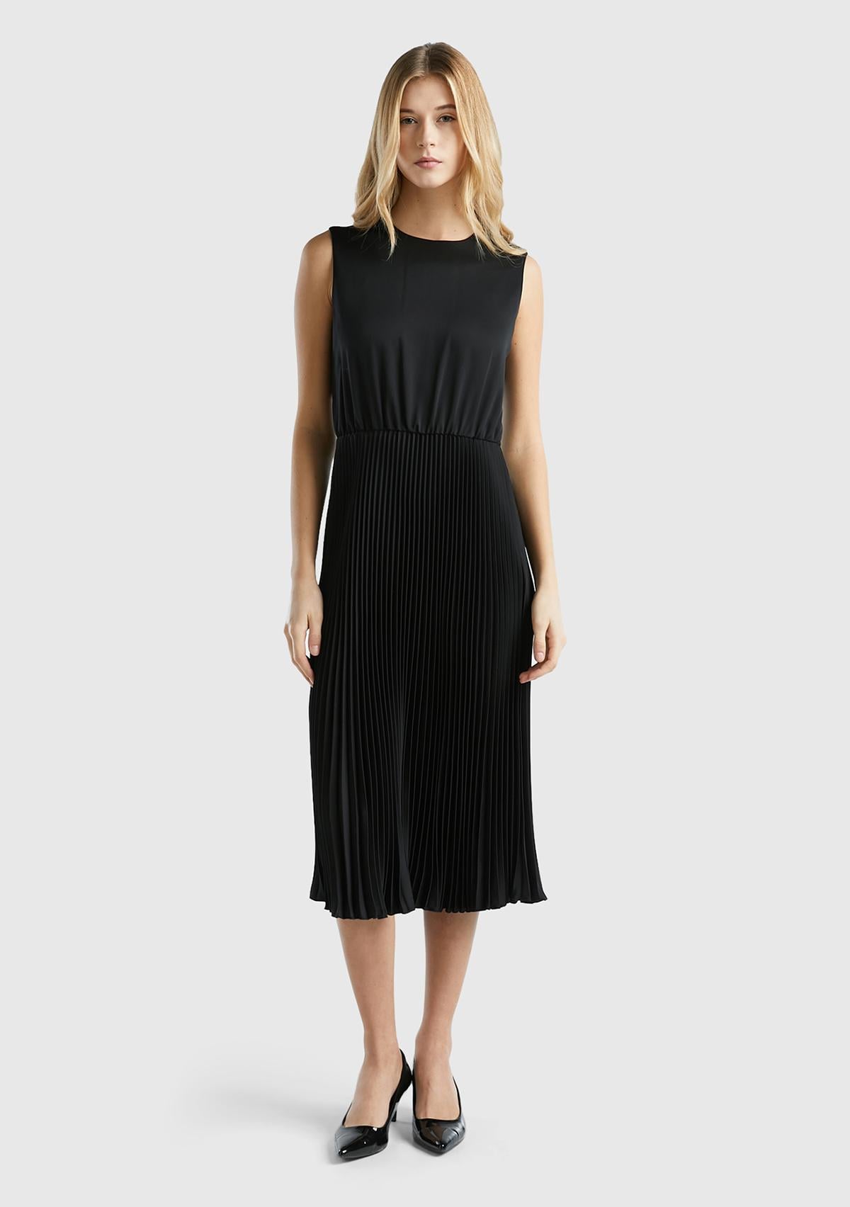 Parlak kumaştan üretilmiş yuvarlak yakalı, önü detaylı, eteği pileli ve sıfır kollu midi boy kadın elbise. Arkası düğmeli ve yandan gizli fermuarlı. Şık ve modern tasarımıyla stil sahibi kadınların favorisi.