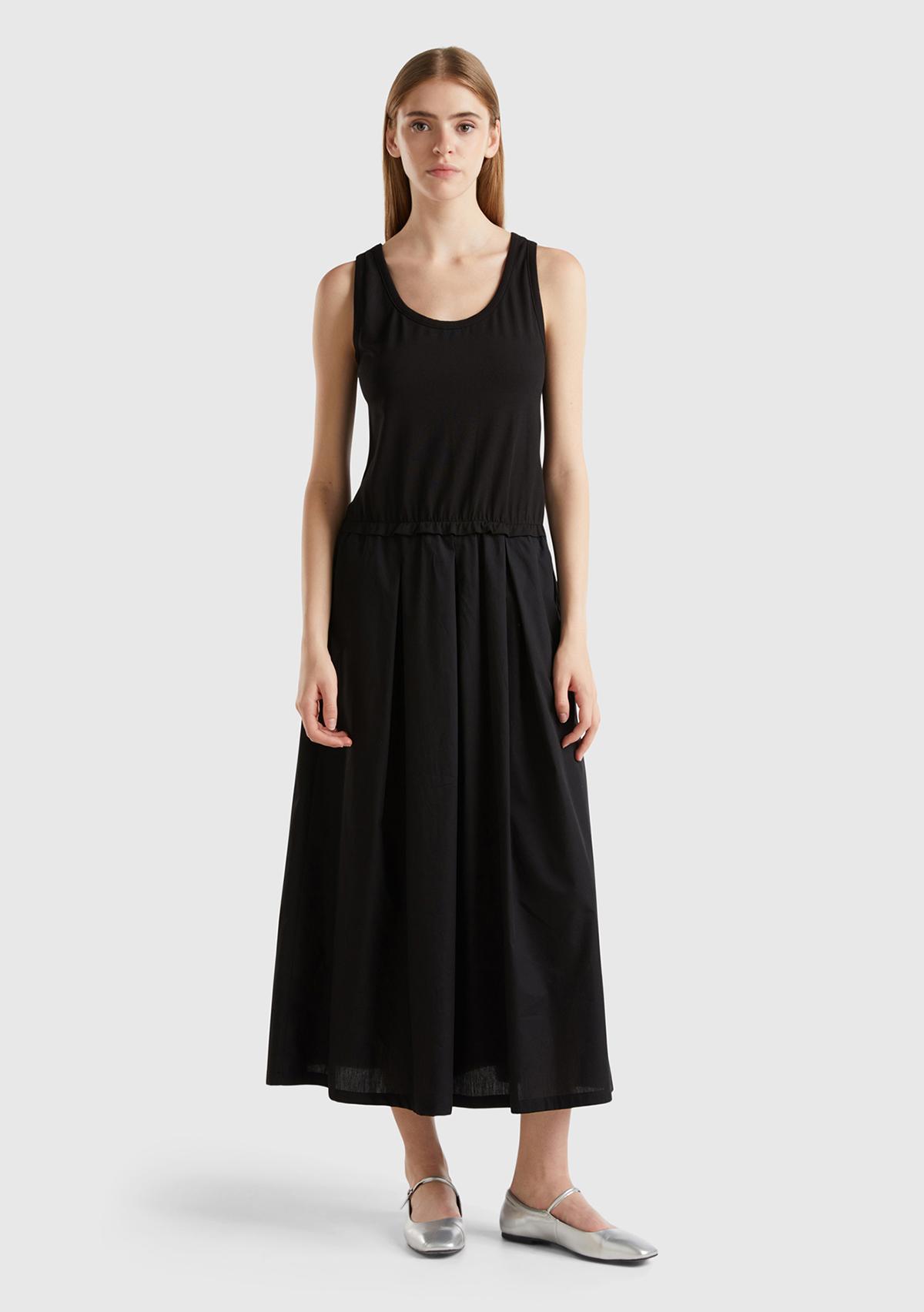 Kadın Siyah Pamuk Karışımlı Hafif Kloş Geniş Yaka Kolsuz Uzun Elbise