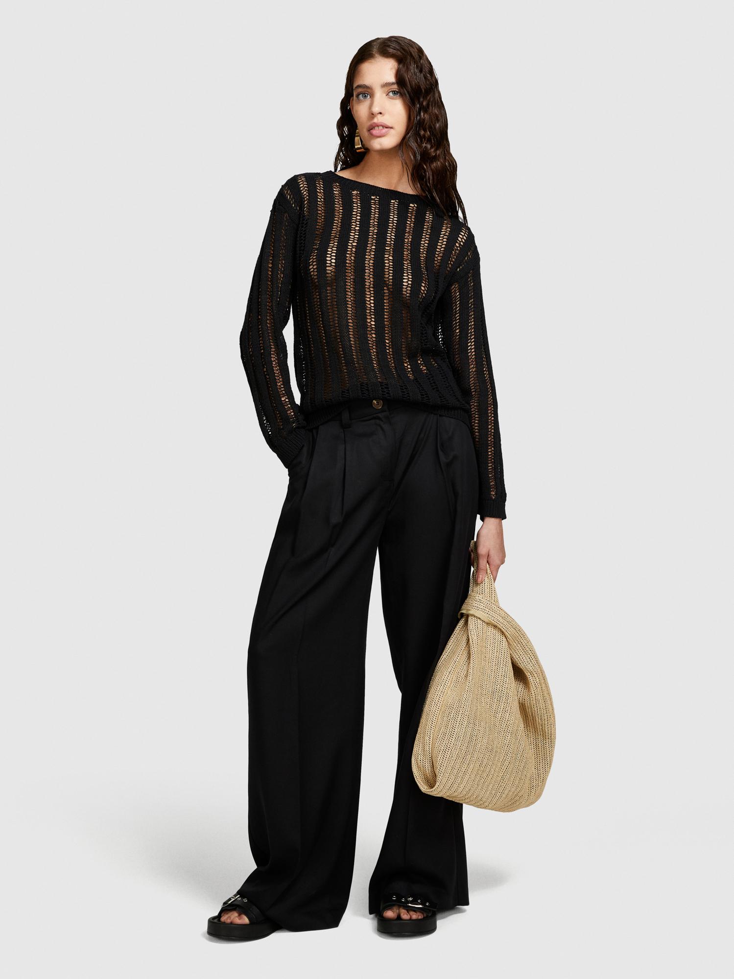 Kadın Siyah Pamuk Karışımlı Örgü Motifli Düşük Omuzlu Kayık Yaka Kazak