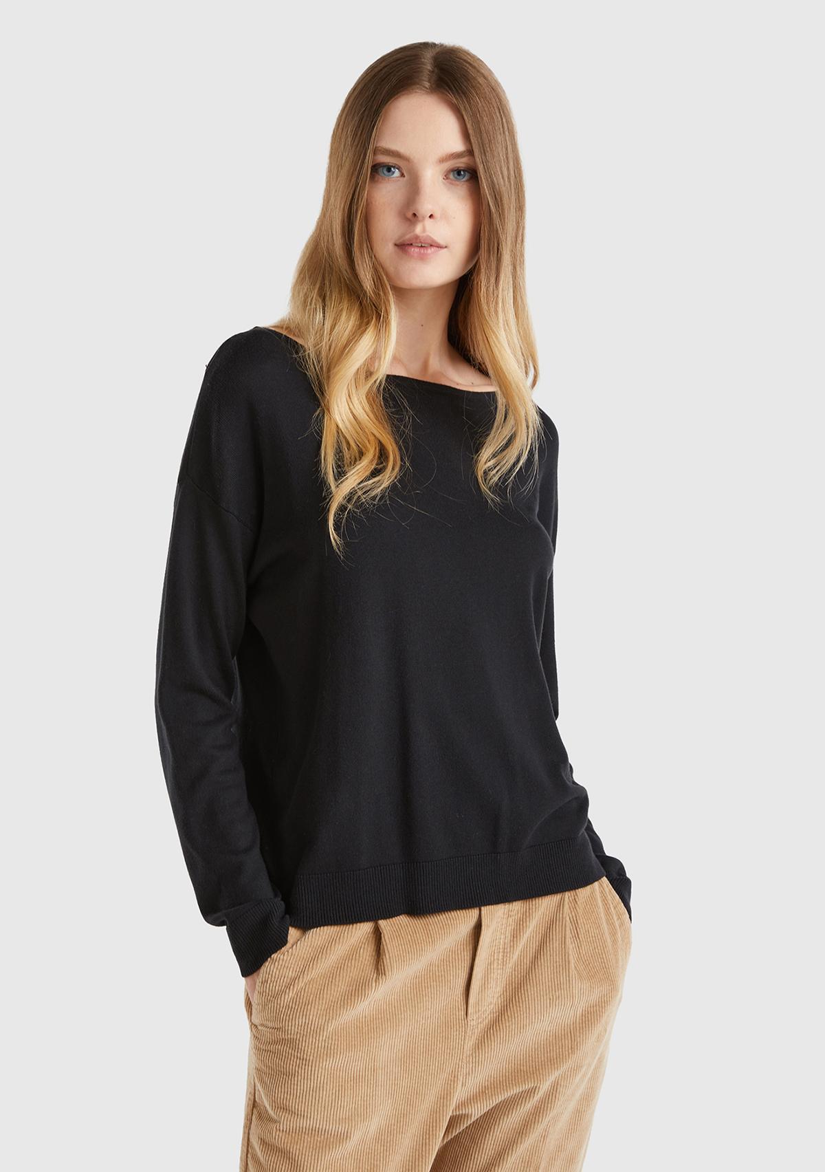 Kadın Siyah Pamuk ve Modal Karışımlı Ribana Detaylı Kayık Yaka Kazak