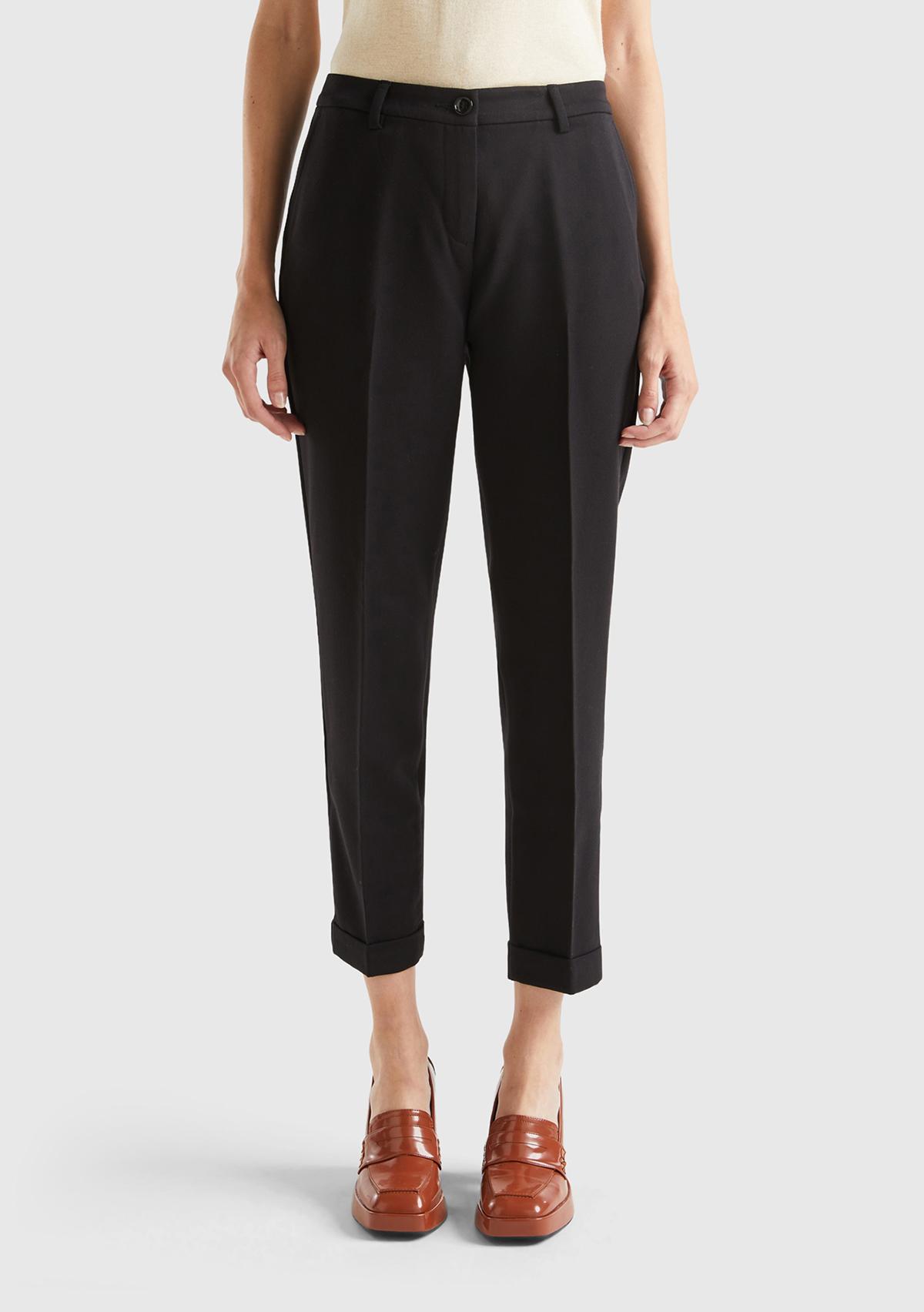 Kadın Siyah Poliviskoz Regular Fit Duble Paça Pantolon