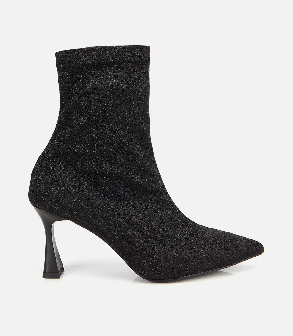 Kadın Siyah Simli Streç Fermuarlı Bilekte İnce Topuklu Bot